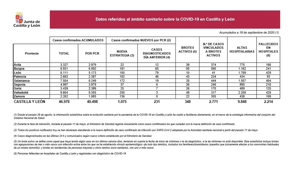 Mala jornada también para Castilla y León, tras notificar este sábado 1.075 nuevos casos de la enfermedad Covid-19, con lo que su número actual acumulado es 46.978; de esa cifra, 40.498 han sido confirmados mediante pruebas PCR.