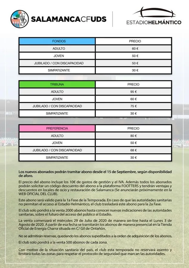 Además, la entidad comentó que pondrá a la venta 350 nuevos abonos para la presente campaña, que estarán disponibles hasta el próximo día 30 de septiembre y repartidos de la siguente forma: 50 en Fondo Sur, 70 en Tribuna, 80 en Fondo Norte y 150 en Preferencia, cuyos precios oscilarán entre los 30 y los 95 euros.