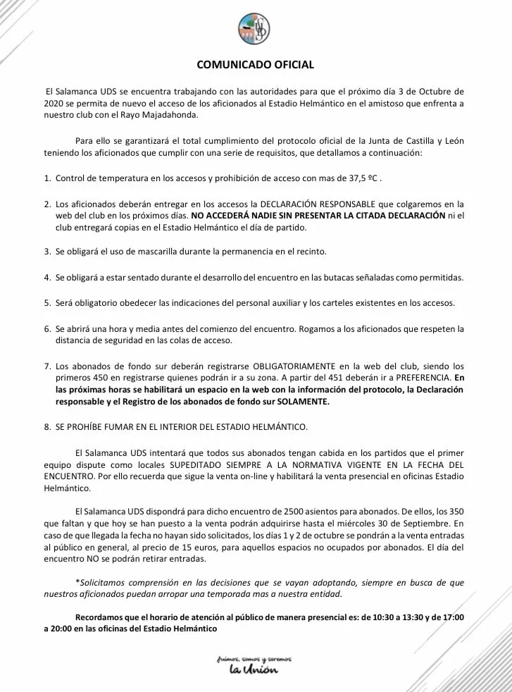 Lee con detalle todas las medidas establecidas por el Salamanca UDS para la cita en la imagen de abajo: