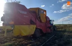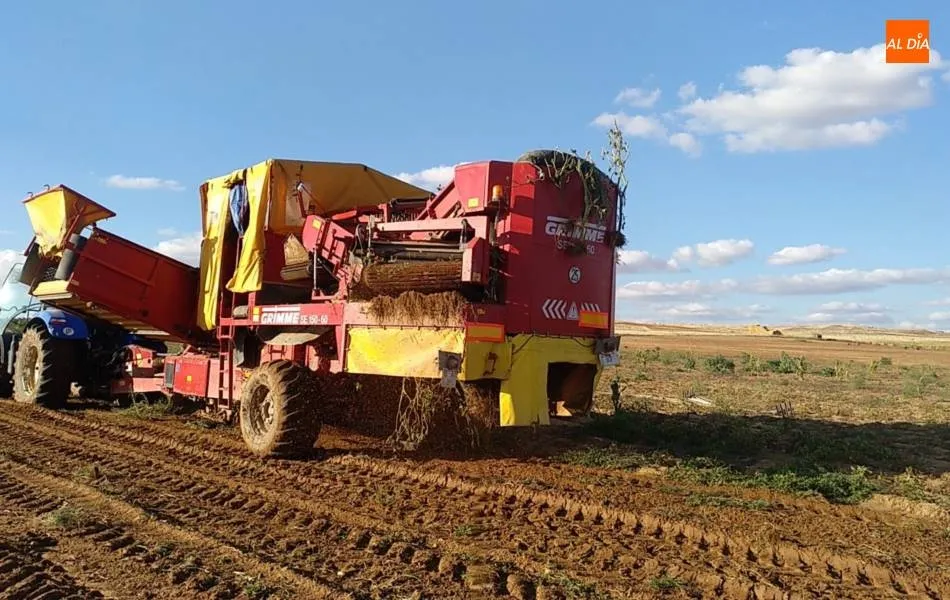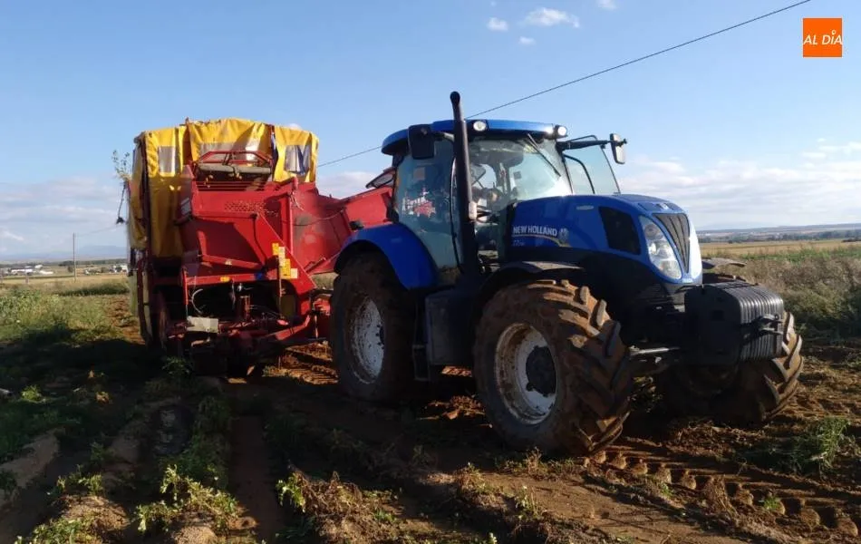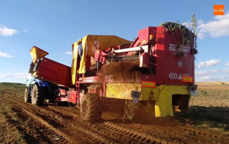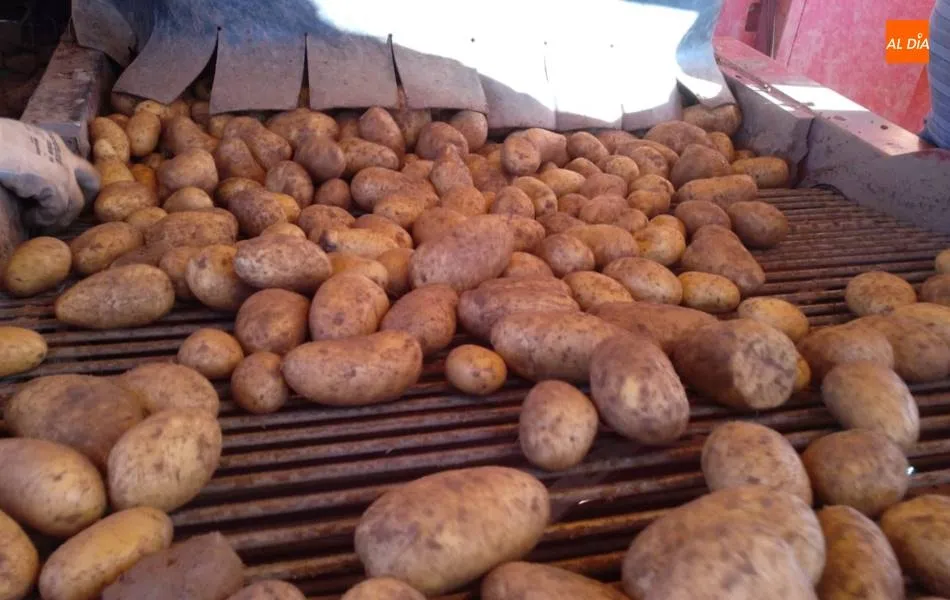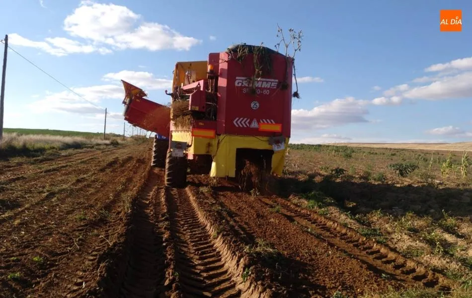 En el campo estos días se trabaja la extracción de la patata de contrato, generalmente amarilla, entre la que la estrella es la Agria, aunque son numerosas las variedades cultivadas. También se escucha gran demanda de patata roja por parte de Portugal. Dicen que se están pagando precios de entre 15 y 16 céntimos el kilo por este tipo de tuberculo que tanto gusta en el país vecino. En torno al 95% del consumo luso de patata es de la roja, calcula Rafa Calvo Noreña de Aldearrubia. Este agricultor lleva cerca de 20 años sembrando patatas y hace 14 años que extrae su producción y la de la cooperativa de Aldearrubia con su propia cosechadora.