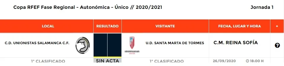 Ya se conoce el emparejamiento con el que se disputará la semifinal charra de la fase autonómica de la Copa Federación. Será el próximo 26 de septiembre (18:00 horas) y medirá a Unionistas y el Santa Marta, con la oficialidad por parte de la FCYLF de que se celebrará en el Reina Sofía, en la ansiada búsqueda de un pase para la final del próximo día 3-4 de octubre ante la Arandina o el Bupolsa, que también tendrá lugar en nuestra provincia. Así, el vencedor se clasificaría para la parte nacional de la competición, en la que está encuadrado el Salamanca UDS.