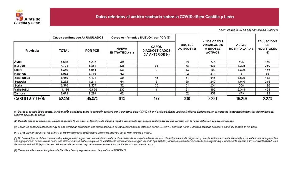 Preocupantes datos los que arroja Castilla y León que notifica hoy 913 nuevos casos de la enfermedad COVID-19, con lo que su número actual acumulado es 52.356; de esa cifra, 45.873 tienen confirmación a través de analítica PCR.