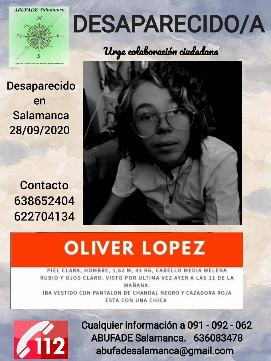 Un niño de 12 años ha desaparecido en Salamanca. Oliver López fue visto por última vez ayer a las 11:00 horas. Se trata de un joven de 1,62 metros de altura, 43 kilos de peso, media melena rubia y ojos claros. Viste pantalón de chandal negro y cazadora roja y podría estar en compañía de una chica. La familia pide colaboració