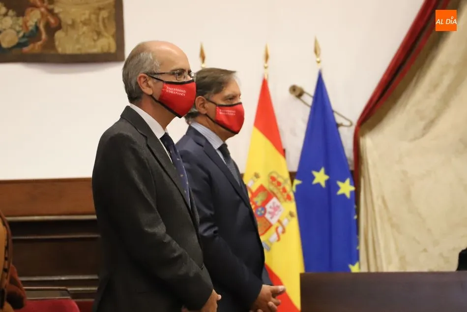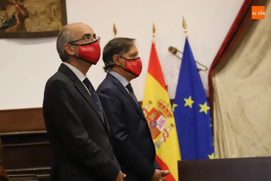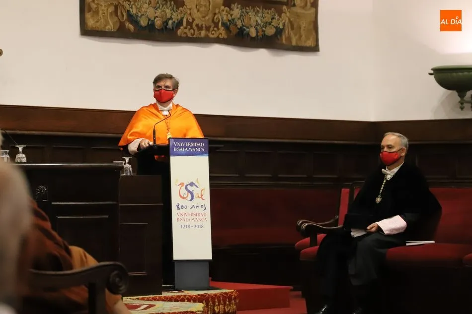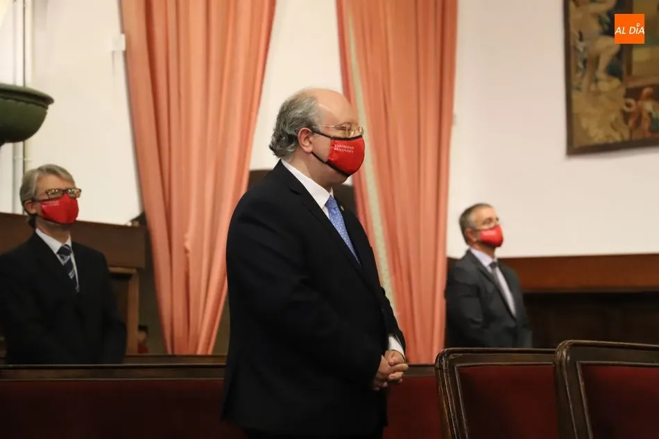 En su intervención destacó la vocación de servicio público de la Universidad y elogió la respuesta dada por toda la comunidad universitaria a la pandemia. ?La Universidad de Salamanca ha estado en todo momento cerca de la sociedad en esta compleja circunstancia, mostrando su apoyo a través de diferentes proyectos como la fabricación de material sanitario de protección mediante la impresión 3D (FabLab), la elaboración de gel hidroalcohólico para el complejo hospitalario de Salamanca (Facultad de Farmacia), prestando apoyo psicológico a la comunidad (Facultad de Psicología), creando entornos virtuales de apoyo mutuo (#pensandoenti y #USALcontigo), poniendo a disposición de las autoridades sus espacios, como es el caso del Colegio Fonseca, y colaborando con el sistema sanitario a través de la puesta en marcha del laboratorio de diagnóstico de COVID-19?, apostilló.