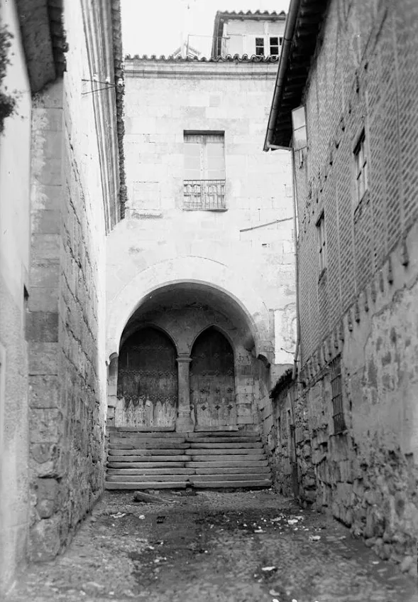 En las fotografías adjuntas se nos muestra tal como fue, vemos la pequeña calleja llamada del Desfiladero y un arco de medio punto por el que, mediante una escalera, se llegaba a dos arcos ojivales, separados por una columna, por donde se accedía al Patio de Escuelas Menores. Este acceso se conserva en el interior del colegio Mayor Fray Luis de León.