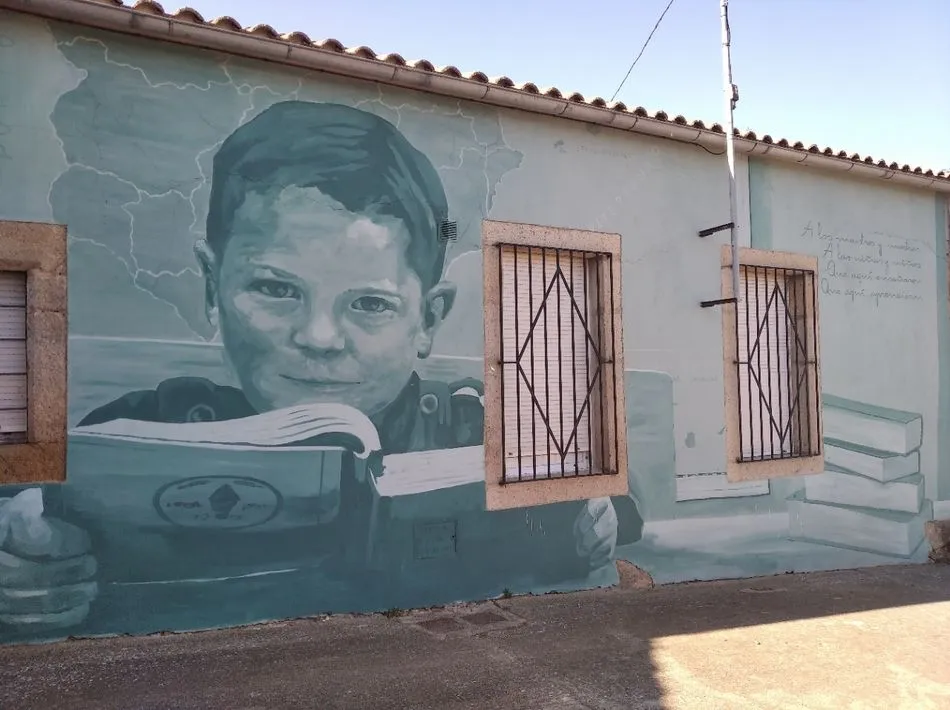 Otro de los murales está dedicado a la escuela de la localidad, a sus maestros y niños, cerrada hace más de 40 años. En él se recoge la imagen real de un niño de Sardón de los años 60 con el siguiente texto.
