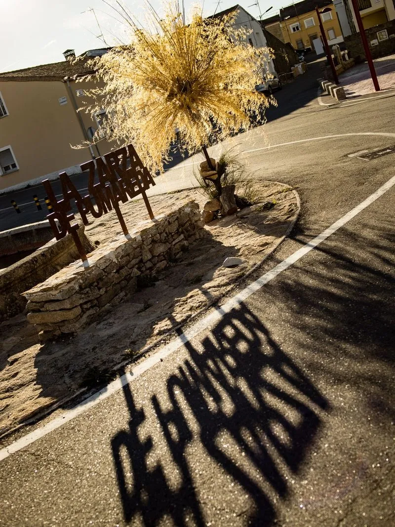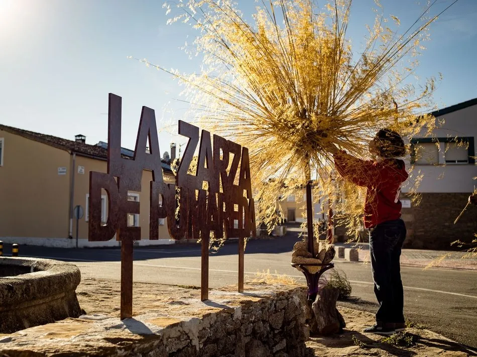 De la mano de la diseñadora floral Marga Martín, La Zarza de Pumareda recibía este fin de semana al otoño con una curiosa ?palmera dorada? confeccionada con pajas de barceo (Stipa gigantea). Esta instalación artística efímera mide unos dos metros de ancho por tres de alto y gira con el viento.