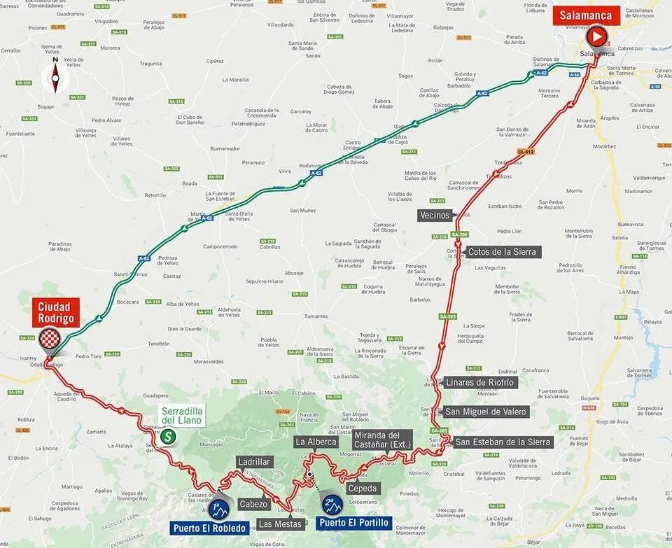 Respecto a otros momentos de referencia de la etapa, el paso por la localidad de La Alberca (a 75 kilómetros de meta) se producirá entre las 15.10 y las 15.25 horas; por el Alto del Portillo (de 2ª categoría), entre 15.16 y 15.31 horas; y por el Alto de El Robledo (de 1ª categoría), entre 16.10 y 16.31 horas.