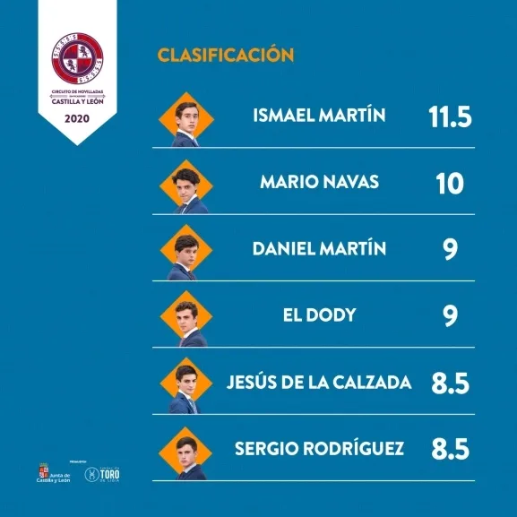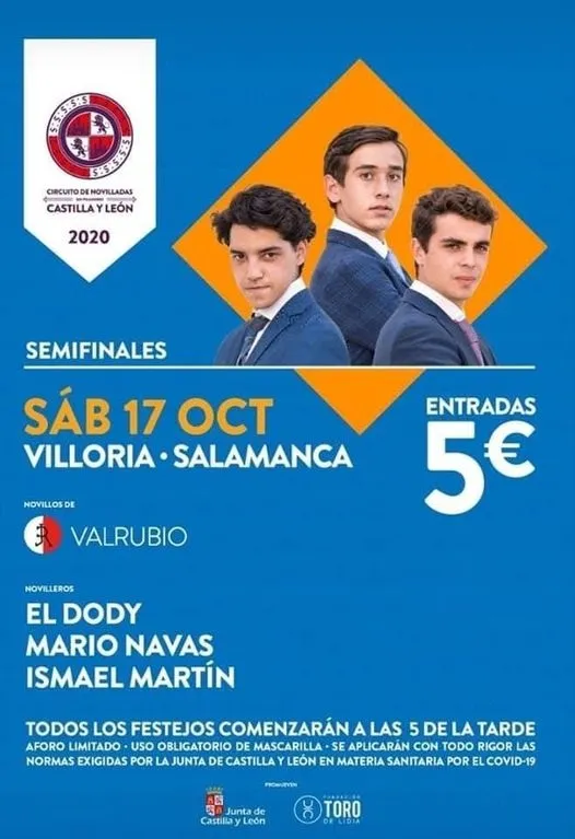 El Dody, Mario Navas e Ismael Martín lidiarán seis novillos en la plaza de toros de La Vega de Villoria este sábado. Los tres novilleros han pasado a la semifinal del Circuito de Novilladas sin picadores de Castilla y León junto a Daniel Martin, Jesús de la Calzada y Sergio Rodríguez, aunque estos últimos participarán como semifinalistas en la novillada que tendrá lugar en Cantalejo el domingo. De estos seis, tres resultarán finalistas y competirán en la plaza de toros de Medina del Campo el sábado 24 de octubre.