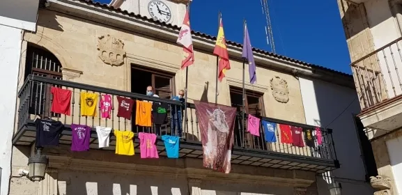 Las camisetas de 23 peñas albenses, muchas de ellas con décadas de historia, lucen desde hoy y hasta el 25 de octubre en el balcón del Ayuntamiento de Alba de Tormes, situado en la Plaza Mayor, como homenaje a este colectivo muy arraigado en la villa ducal.