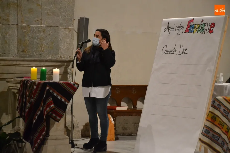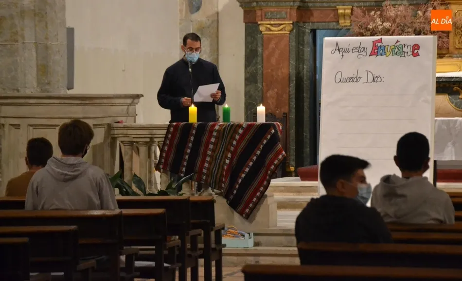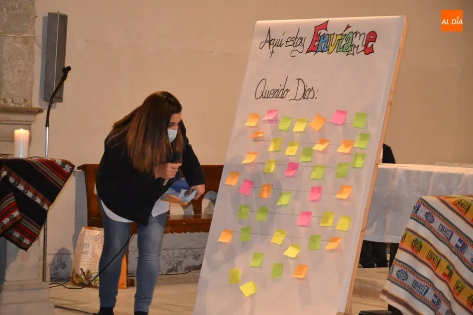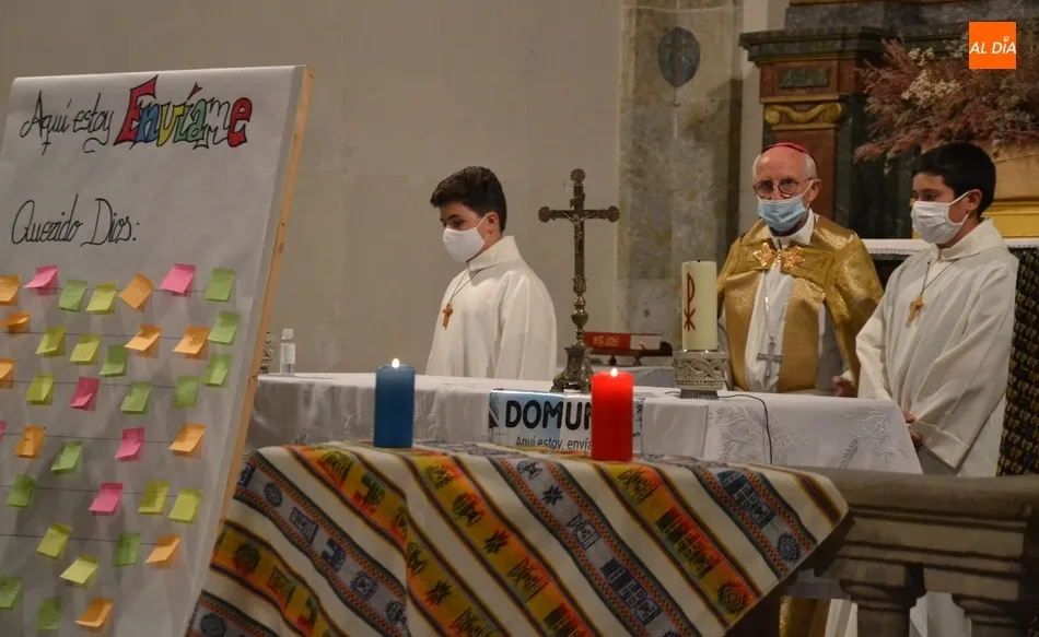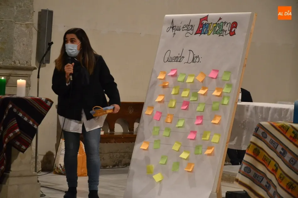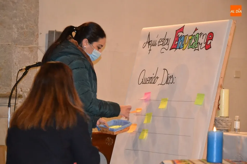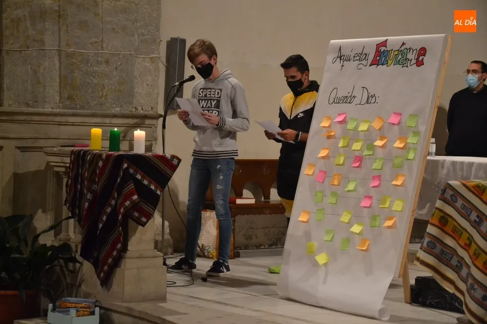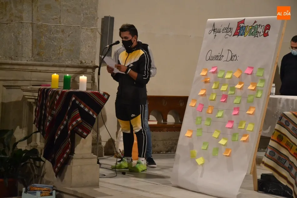 La Vigilia, presidida por el Administrador Apostólico de la Diócesis, Jesús García Burillo, tuvo como eje conductor el lema del Domund de este año, Aquí estoy, envíame, invitándose a todos los presentes a que escribiesen en unos post-it sus cualidades personales para ?mandarlas a Dios?, según señaló Mar Manzano, colaboradora de la Delegación.