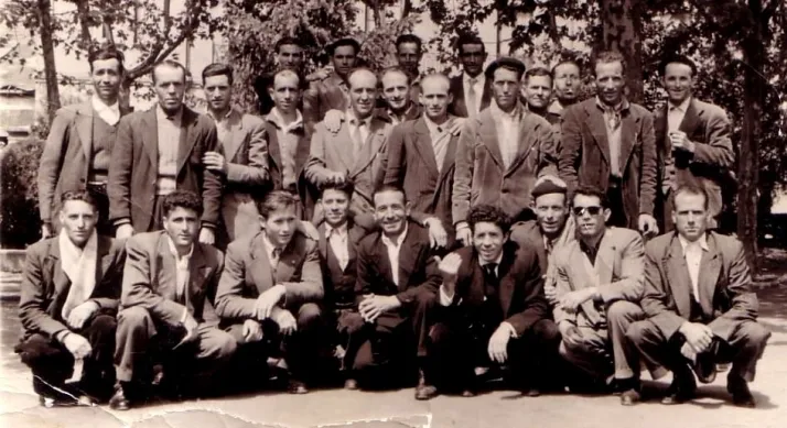 Me he hecho con la fotografía de los obreros macoteranos que marcharon a los Alpes, y que fueron los pioneros de la emigración en 1961. No están todos, pues lo más jóvenes se marcharon de pindongo. Entre ellos, se encontraban Juan Machaca, José el Cabra, Miguel Barroso, Miguel Berrendo, Pedro Hernández, Francisco Purina y Antonio Pondera. Todos los demás posaron ante la cámara en el jardín de la estación.