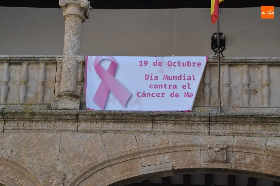 La balconada de la Casa Consistorial de Ciudad Rodrigo se ha sumado a la conmemoración del Día Internacional contra el Cáncer de Mama que aparece en el calendario el próximo lunes 19 con la colocación en la misma de la tradicional pancarta alusiva por parte de la Junta Local de la Asociación Española contra el Cáncer.