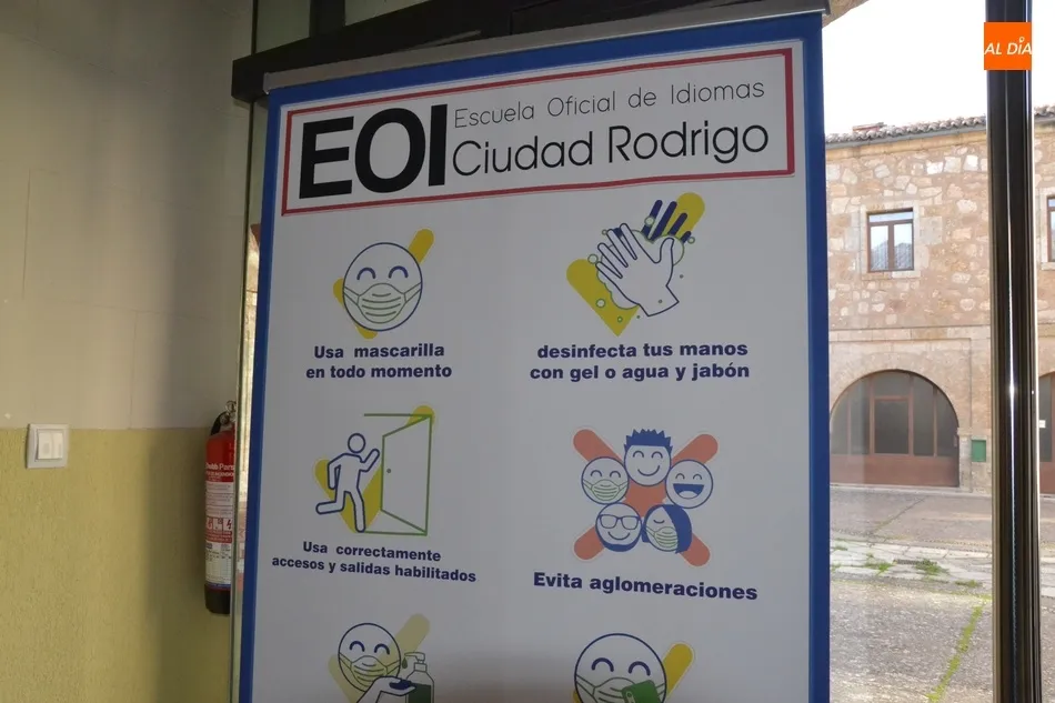 La Sección de Ciudad Rodrigo mantiene las enseñanzas de varios niveles de Inglés y Portugués, estando totalmente preparado el centro para la nueva era marcada por el coronavirus (que de hecho ya se estrenó con los exámenes que hubo en septiembre), con gel y una alfombra de desinfección en el hall de entrada, dispensadores de gel en la entrada a cada aula, y dentro de las mismas, material de desinfección y las mesas totalmente separadas (en este centro suelen colocarse por grupos).