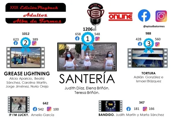 La canción ?Santería?, interpretada por las hermanas Teresa y Elena Briñón acompañadas de Judith Díaz, ha resultado ser el video ganador del XXIX edición de playback que en esta ocasión se ha celebrado de manera online. En total el grupo ganador recibió 1206 votos, repartidos entre las redes sociales Facebook e Instagram.