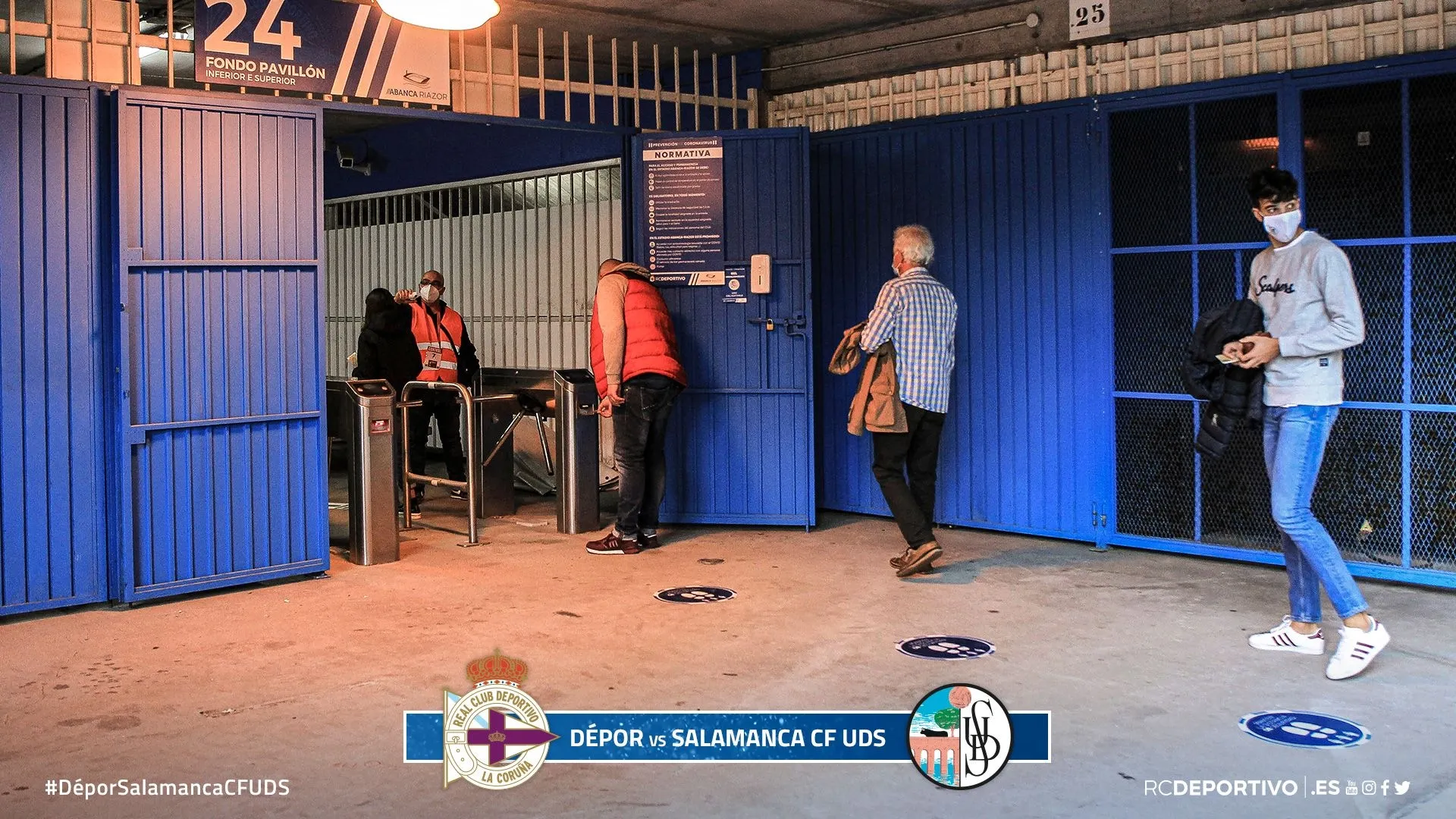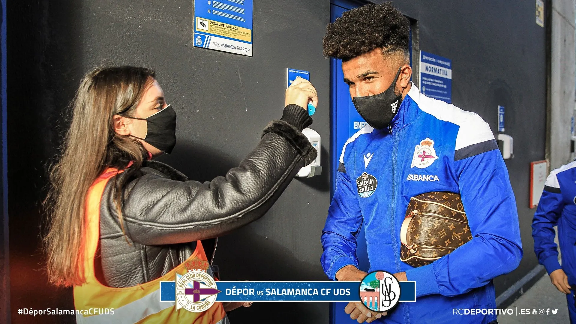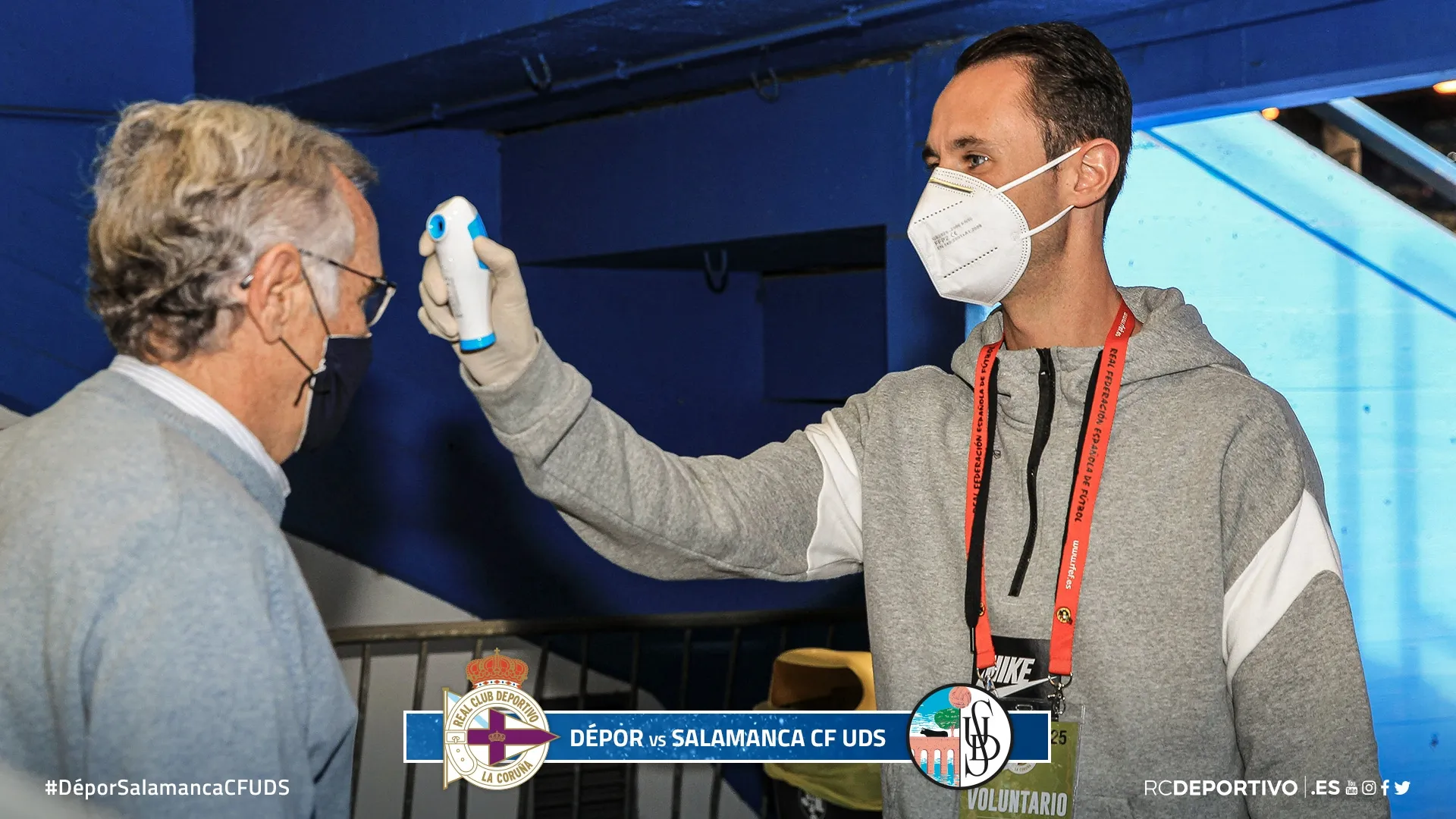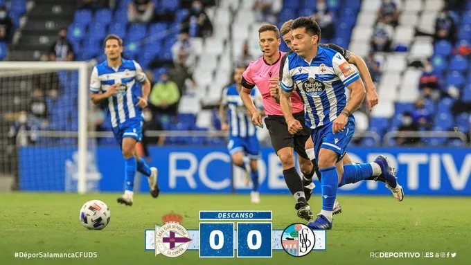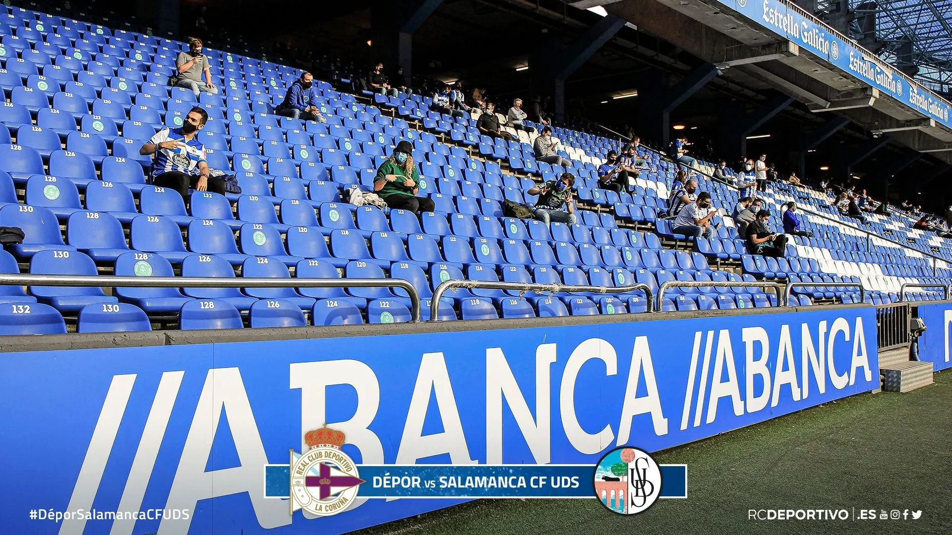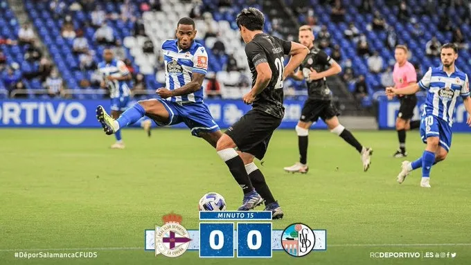 Mientras, Fernando Vázquez, que no pudo sentarse en el banquillo por una sanción del curso anterior, apostó por un 4-2-3-1 de garantías en el que formaron: Abad; Eneko Bóveda, Granero, Mujaid, Salva Ruiz; Celso Borges, Bergantiños; Nacho González, Lara, Keko Gontán; Beauvue. De este modo, la contienda arrancó con un Deportivo de La Coruña que salió a apretar a los salmantinos, que lucieron tercera indumentaria, de color negro, en honor a las víctimas por la pandemia del coronavirus. Claudio Beauvue tuvo en un remate de cabeza la primera oportunidad para batir a Jiménez, pero se le marchó desviado. Más tarde, Candelas contestó con un disparo desde fuera del área que se fue muy lejos del arco de Abad.