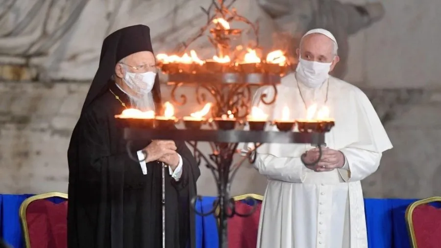 El Papa empezaba su homilía durante la oración en la basílica con las siguientes palabras: ?Es un don rezar juntos. Agradezco y saludo con afecto a todos vosotros, en particular a Su Santidad el Patriarca Ecuménico, mi hermano Bartolomé y al querido Obispo Heinrich, presidente del Consejo de la Iglesia Evangélica en Alemania. Desafortunadamente, el Reverendísimo Arzobispo de Cantorbery Justin no pudo venir debido a la pandemia?.