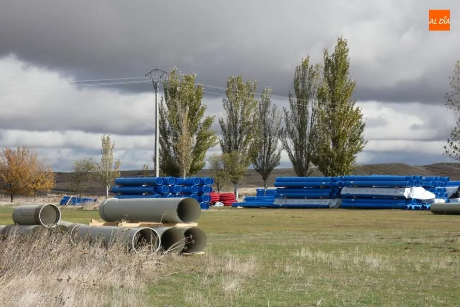 En las eras de Poveda de las Cintas se ha establecido el centro de operaciones. Se han instalado oficinas provisionales y se reciben los kilómetros de tubería que después serán enterrados en su lugar definitivo.