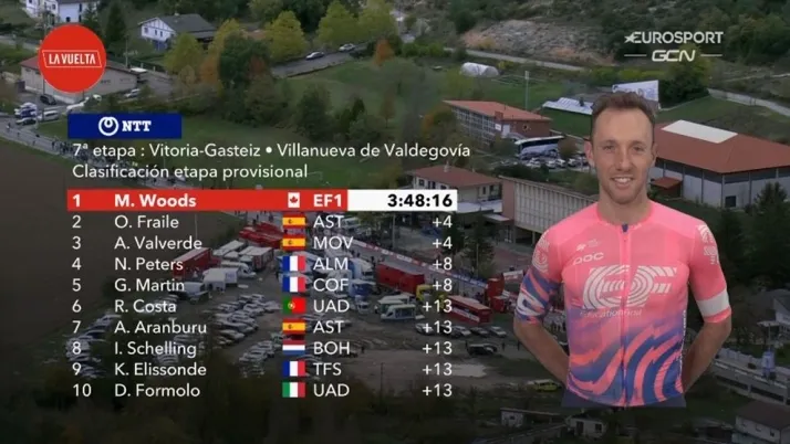 Michael Woods consiguió sorprender a todos para llevarse una etapa espectacular en Orduña. Por su parte, Richard Carapaz sigue contando con una ligera ventaja sobre Roglic en la general.