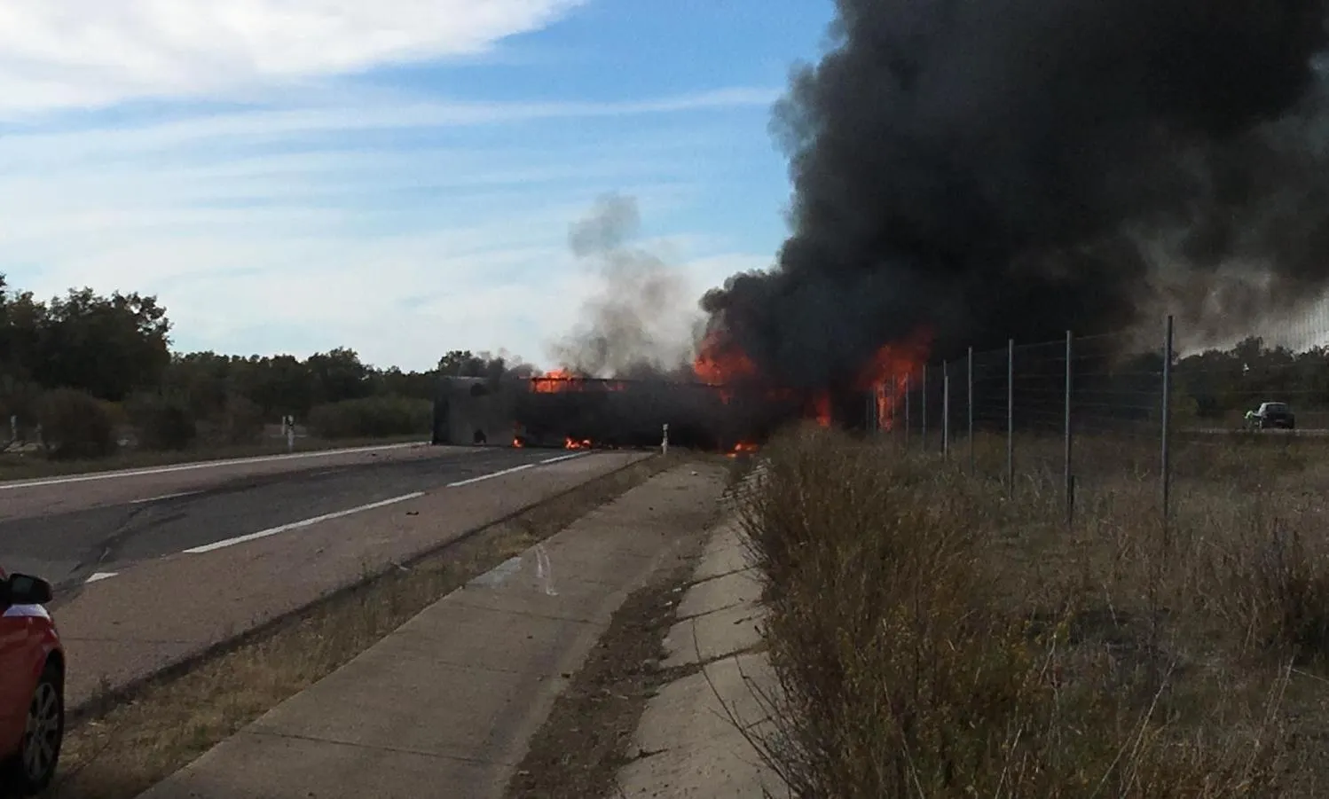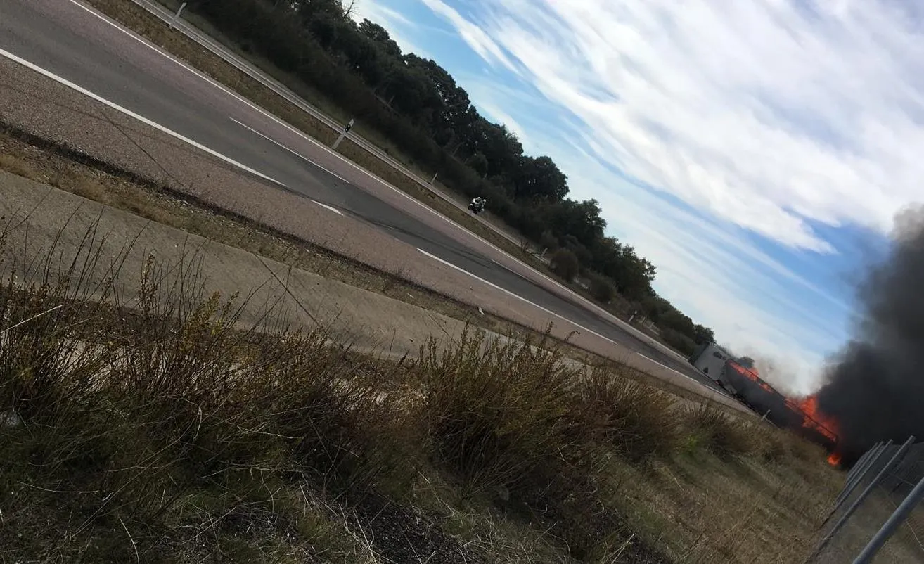 Un camión que iba circulando a media mañana del sábado por la Autovía A-62 en dirección a Portugal acabó calcinado tras haber volcado previamente en plena calzada, todo ello a la altura de Martín de Yeltes.