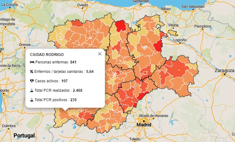 El resto de zonas básicas de la comarca de Ciudad Rodrigo se mantienen en naranja, salvo la de Fuentes de Oñoro, que continúa en verde, con un único test más realizado como única variación en sus datos estadísticos (en total este domingo se contabilizan 38 tests PCR más realizados, 18 de ellos en la Zona de Ciudad Rodrigo y 10 en la de Fuenteguinaldo).