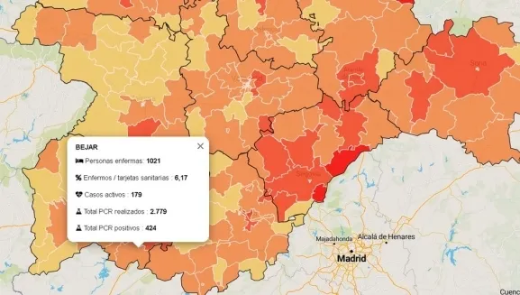 Según los datos oficiales de la Junta de Castilla y León el total de personas enfermas asciende a 1.021, el 6,17 % de enfermos por tarjetas sanitarias registradas en la ZBS de Béjar y 179 casos activos. El total de PCR realizados hasta hoy ha sido de 2.779, de los que han dado positivos 424.