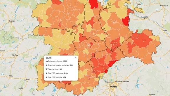 Los datos corresponden a la zona básica de salud de Béjar. Hay que tener en cuenta que las zonas abarcan más de un municipio, por lo que los datos corresponden a toda la zona y no exclusivamente al municipio. Los datos de número de afectados y el porcentaje de ellos en proporción al número de tarjetas sanitarias, son facilitados oficialmente por la Junta de Castilla y León (enlace a los datos oficiales de la Junta de Castilla y León)