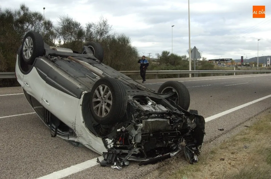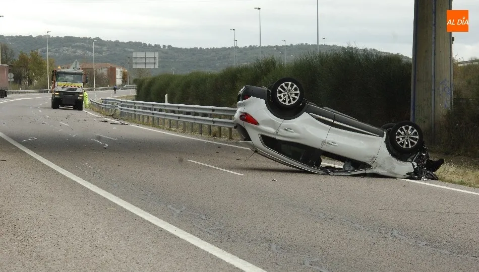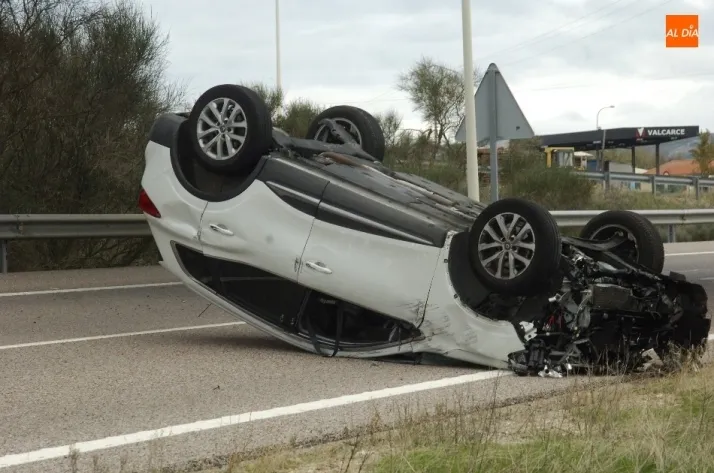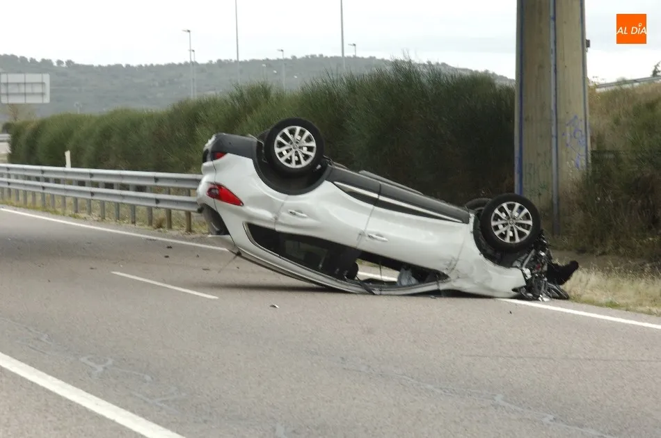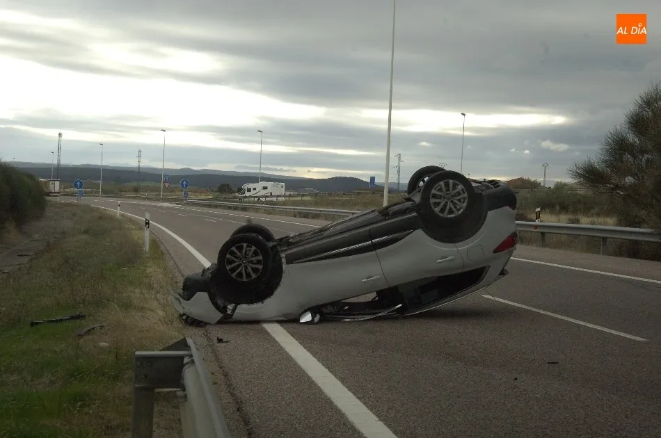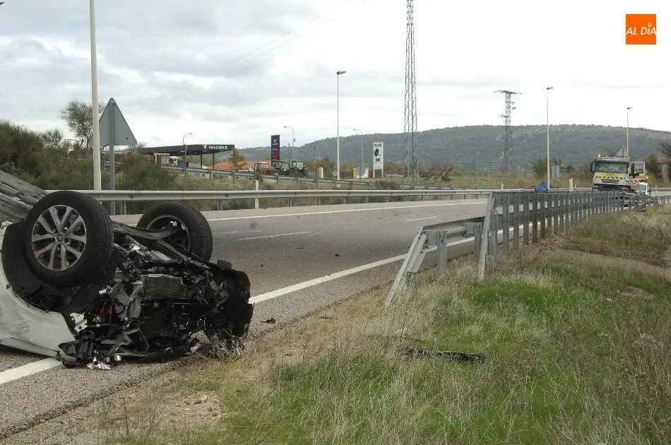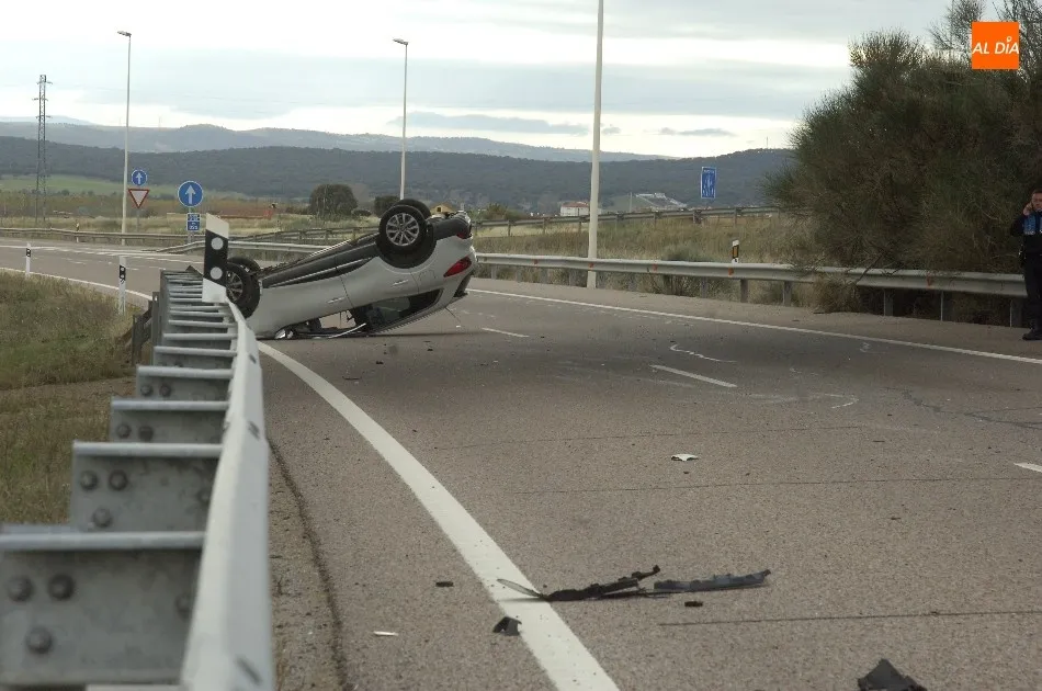 Un vehículo con una única ocupante en su interior acabó volcado a primera hora de la tarde del miércoles en plena A-62 a su paso por Ciudad Rodrigo tras haber golpeado previamente, de forma virulenta, contra un quitamiedos de la vía.