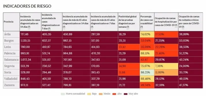 Según los datos de este jueves, todas las provincias se encuentran en situación de 'Nivel de alerta 4', ya declarada por la Junta a partir de este viernes. Las nueve se encuentran en el nivel más alto (riesgo extremo) en los cinco primeros indicadores, al igual que en la ocupación de camas para críticos y, en el caso de la positividad global solo Soria, Segovia y León se encuentran por debajo del peor de los niveles, en concreto con 'riesgo alto'.