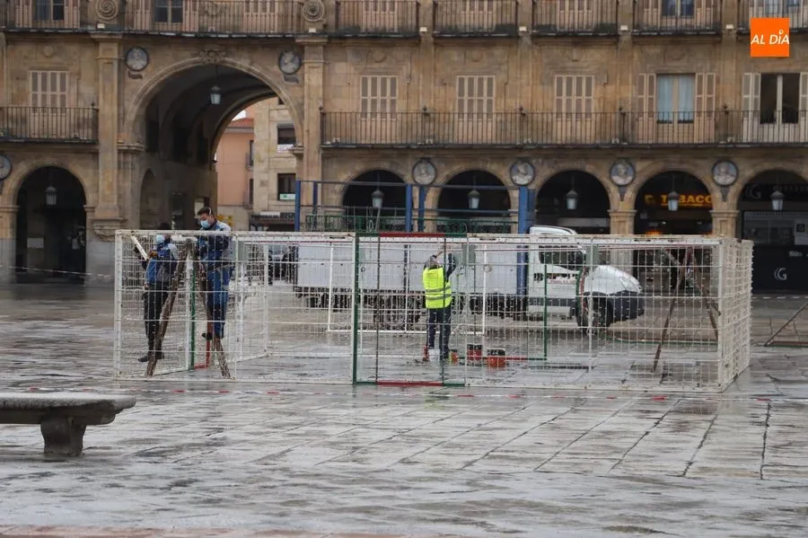 Este viernes ha comenzado en la Plaza Mayor el montaje del gran regalo navideño luminoso, que adornará el centro de la ciudad. En este 2020 el Ayuntamiento de Salamanca refuerza la iluminación decorativa de la Navidad 2020-2021 como medida de apoyo al comercio local de cara a la próxima campaña de ventas navideñas y con el objetivo, también, de incentivar la participación en los barrios de la ciudad en un año atípico, marcado por la pandemia.