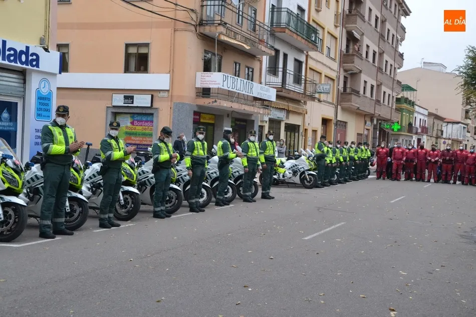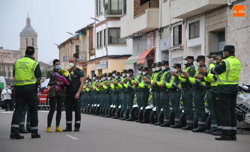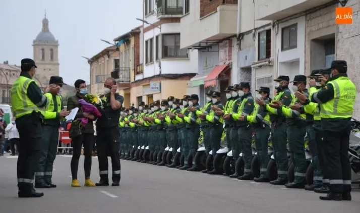Una vez concluida la etapa de La Vuelta, la vía de servicio izquierda de la Avenida de Salamanca fue escenario de un emotivo momento: un homenaje a José Antonio Salicio, el agente de Tráfico de la Guardia Civil del Destacamento de Ciudad Rodrigo que falleció el pasado mes de abril mientras se encontraba de servicio al sufrir un accidente de tráfico en el tramo entre El Maíllo y El Cabaco de la carretera SA-220.