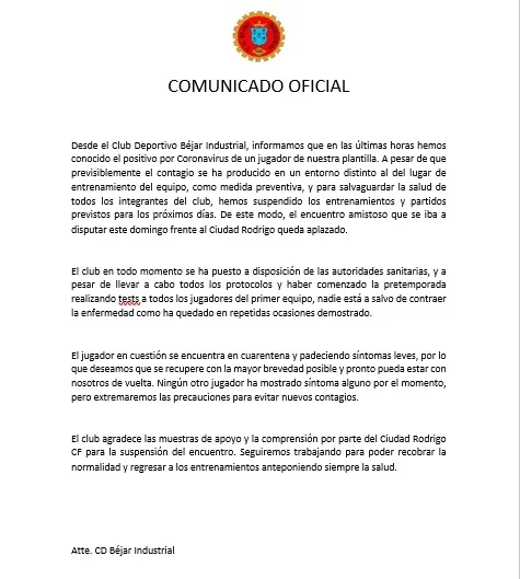Un positivo de un jugador del Béjar obligó al club a parar los entrenamientos a dos semanas del inicio de Liga en la Regional de Aficionados. La entidad textil fue la encargada de dar la noticia mediante su cuenta de Twitter.