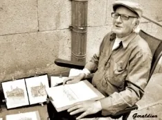 En un rincón del Patio Chico aparece la figura de un personaje, acurrucado en una silla plegable de playa, con sus gafas eternas de pasta oscura, que simulan una mirada pícara de hombre forofo de la libertad descarnada y de perfil de lince, que no se le escapa el menor detalle de la realidad, que adherir al lienzo; con su cabellera blanca, menos por los años, que por el contagio de las nieves, que tanto aprisionó en aquellos lienzos de paisaje serrano de Cuevas del Valle y de Navaluenga. No deja en casa, nunca, su sombrero negro de anchas alas o su visera de cuadrines, que estrenó aquella tarde de san Roque, cuando lanceó aquel novillo de Flores, Yo creo que, aquella tarde, decidió caminar por libre en esta vida, con sus personales condicionamientos de bohemio de cuna; y así se siente y se disfruta feliz, realizando aquello que conoce a las mil maravillas, como es pintar; sin duda, es el artista que más y mejor ha pintado todos los rincones monumentales y callejeros de Salamanca, con sus luces y sus sombras, con sus colores dorados y azules, limpios de sol; cientos de lienzos y láminas recogen la transcripción veraz y perfecta de todo el elenco de nuestro patrimonio cultural artístico.