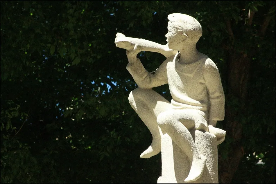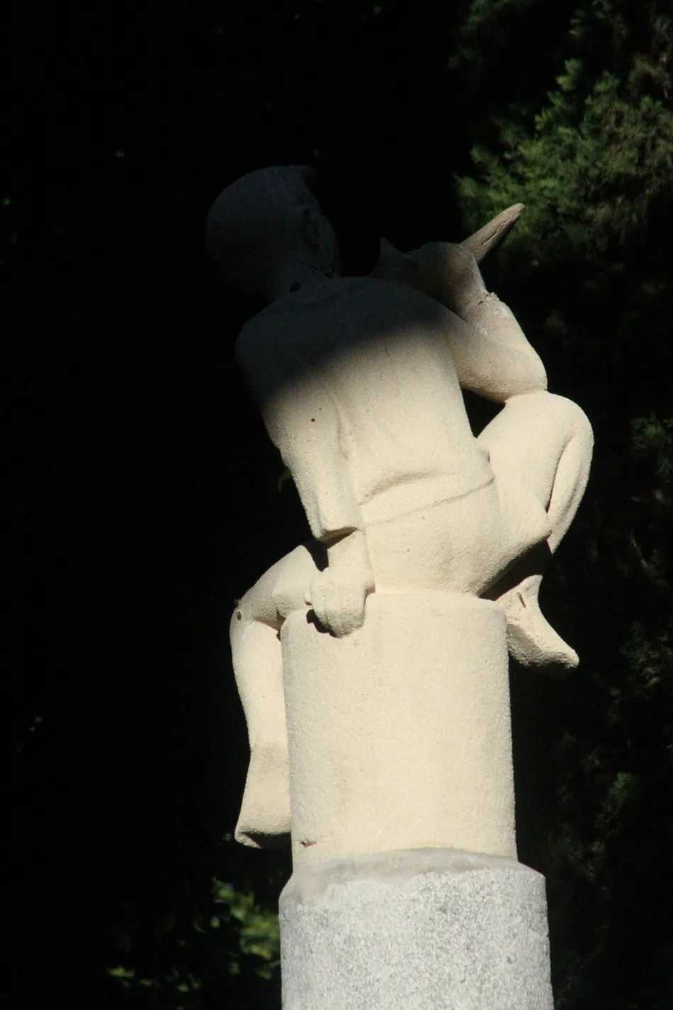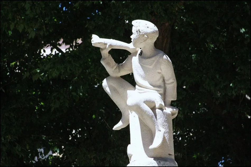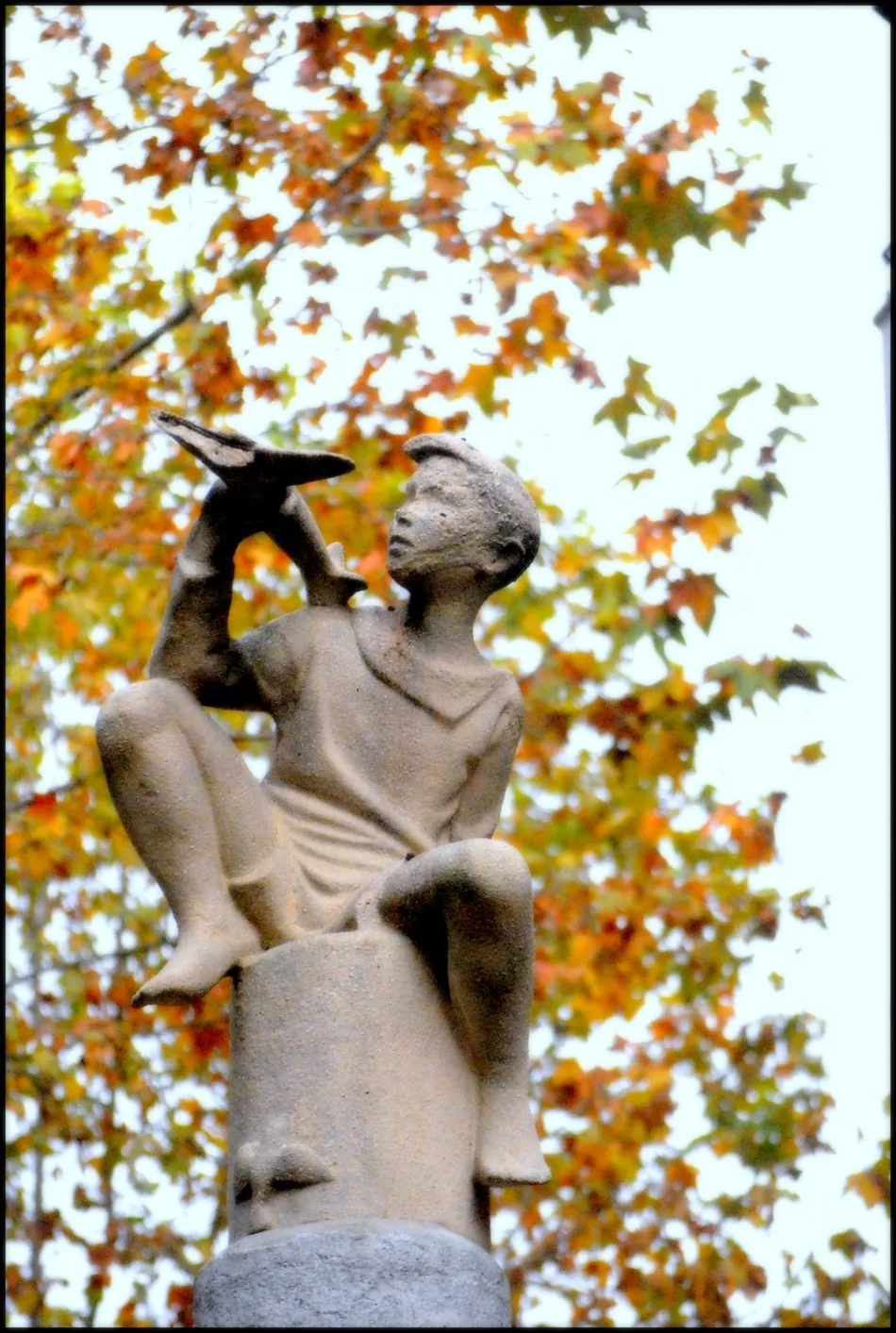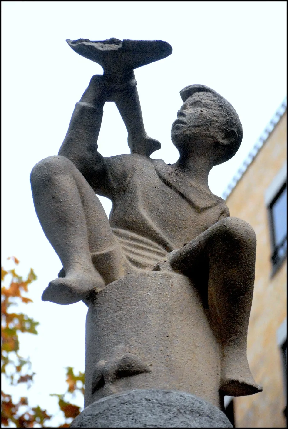 A la ciudad provinciana, a la Salamanca sosegada le gusta la cercanía. Y este niño de Casillas es de todos y de nadie, rapaz que juega en la calle con la libertad de quien acaba las clases, las tareas, la merienda y que sale al sol de todas las tardes a disfrutar de la calle y la pandilla. A volar aviones, a girar la peonza o a esconderse por los rincones de una ciudad amable para la vida. Ese niño, sentado en la rama de su columna, su cucaña, estilita de sí mismo, captado por el escultor con el objetivo de su arte, apenas incorporado, el pie en el estribo, dispuesto al esfuerzo de hacer volar sus ilusiones, es la pieza que el artista prefería por encima de todas sus obras, y que mucho dolor le dio, porque la piedra de Villamayor de la que estaba hecha hubo de sustituirse en los años setenta, y aun así, los efectos de la intemperie resfrían a este zagal que requiere de mimos y restauraciones que no llegan.