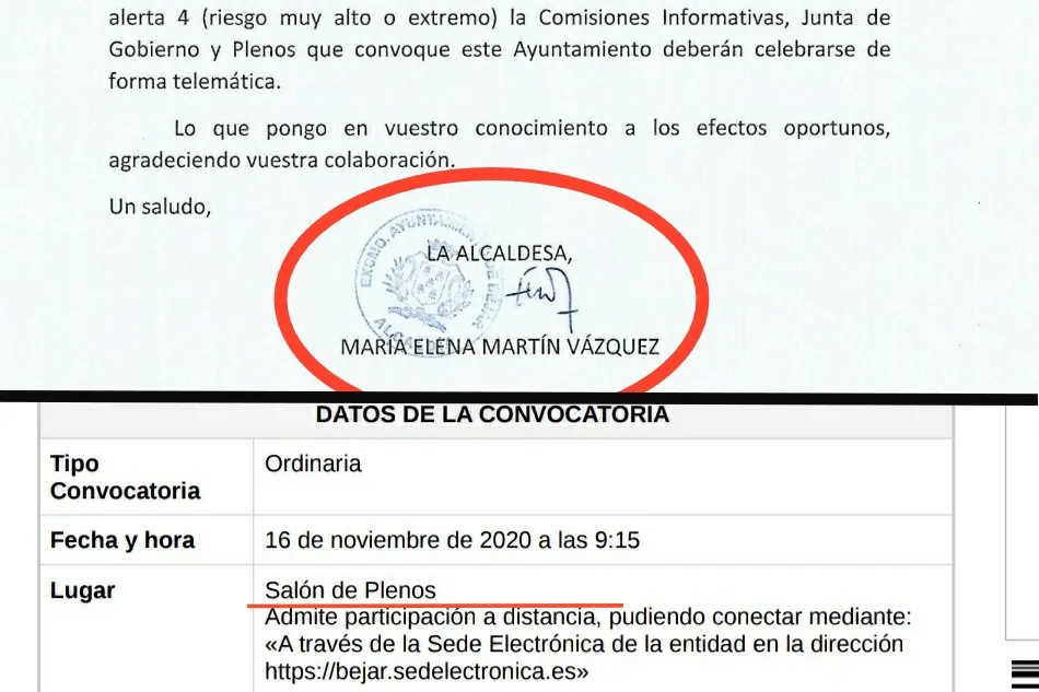 En cuanto al respaldo de todos los concejales socialistas a las decisiones de su Alcaldesa y su defensa de que la declaración de prohibir la asistencia presencial a plenos y comisiones no ha sido tomada por ella de forma unilateral sino con el consenso de todo el grupo municipal, los Populares manifiestan que entonces no saben lo que firman, pues ellos mismo convocaron las comisiones del próximo lunes en el salón de plenos del ayuntamiento, mientras por otro lado la Alcaldesa lo estaba prohibiendo. Los Populares manifiestan que la decisión de modificar las condiciones de asistencia a las Comisiones Informativas del Ayuntamiento de Béjar ?SI ha sido tomada de forma unilateral por parte de la Alcaldesa?, y muestran el escrito con la firma de María Elena Martín Vázquez, remitido por correo electrónico a los concejales, así como el documento de convocatoria a las comisiones del próximo lunes, documentos que se adjuntan en la galería de fotos.