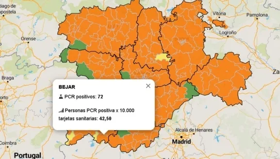 Los datos corresponden a la zona básica de salud de Béjar. Hay que tener en cuenta que las zonas abarcan más de un municipio, por lo que los datos corresponden a toda la zona y no exclusivamente al municipio. Los datos de número de afectados y el porcentaje de ellos en proporción al número de tarjetas sanitarias, son facilitados oficialmente por la Junta de Castilla y León (enlace a los datos oficiales de la Junta de Castilla y León)