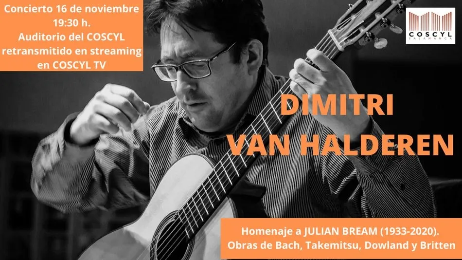 El guitarrista Dimitri van Halderen va a ofrecer un concierto en homenaje a uno de los más grandes guitarristas del siglo XX: Julian Bream (1933-2020). El programa incluirá obras de Bach, Takemitsu, Dowland y Britten y podremos disfrutar de su interpretación en streaming desde el Auditorio de nuestro centro a través del canal de Youtube COSCYL TV el lunes 16 de noviembre a las 19:30 horas.