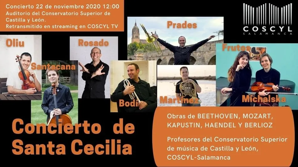 Este año se va a llevar a cabo un concierto para celebrar el día de la patrona de los músicos: Santa Cecilia. Los profesores del Coscyl Marc Oliu (violín), Amat Santacana (violonchelo), Alberto Rosado (piano), Karolina Michalska (violín), Elena Frutos (piano), Rubén Prades (trombón), Roberto Bodí (trompeta), y Miguel Ángel Martínez (trompa) van a ser los encargados de sumergirnos en el