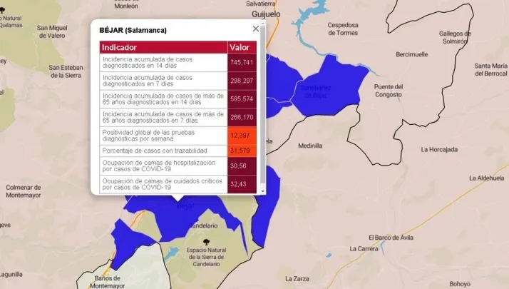 El color granate correspondiente a nivel de riesgo muy alto o extremo define que la incidencia acumulada en Béjar en los últimos siete días es de 298.297, y en los últimos 14 días asciende a 745,741. En mayores de 65 años alcanza los 585,575 en 14 días y los 266,170 en una semana. La positivad global de las pruebas PCR en rojo que corresponde a nivel alto, está en 12,397. En el mismo color rojo se coloca el porcentaje de casos con trazabilidad, con una cifra de 31,579. Las camas de hospitalización por casos COVID que corresponden a la provincia de Salamanca está en 30,56 y la ocupación de camas de cuidados críticos por casos de coronavirus es de 32,43, ambos datos en riesgo muy alto.