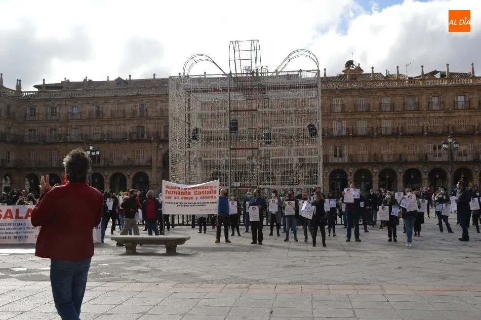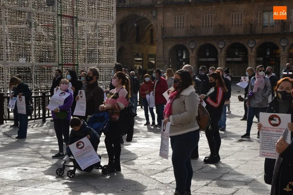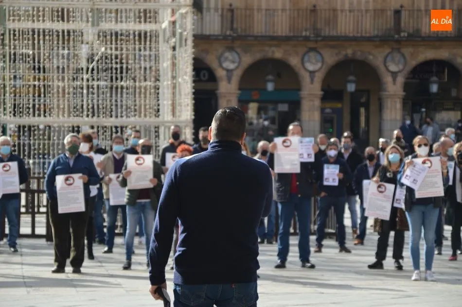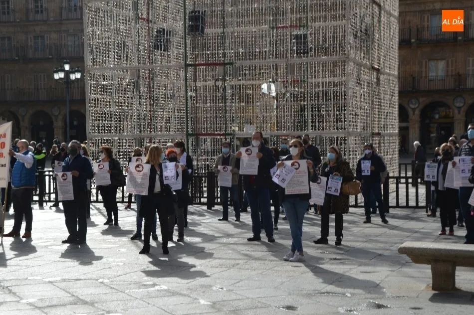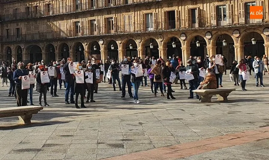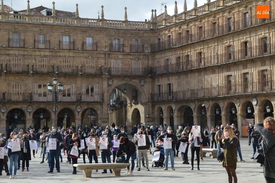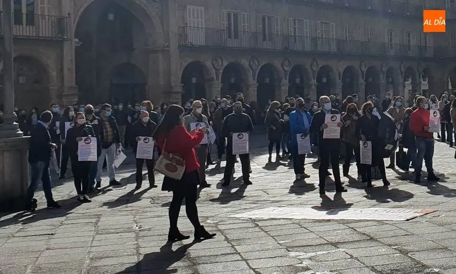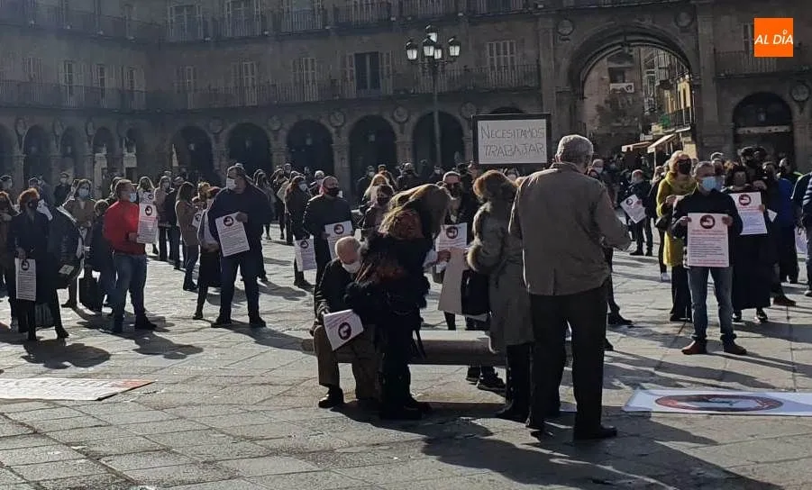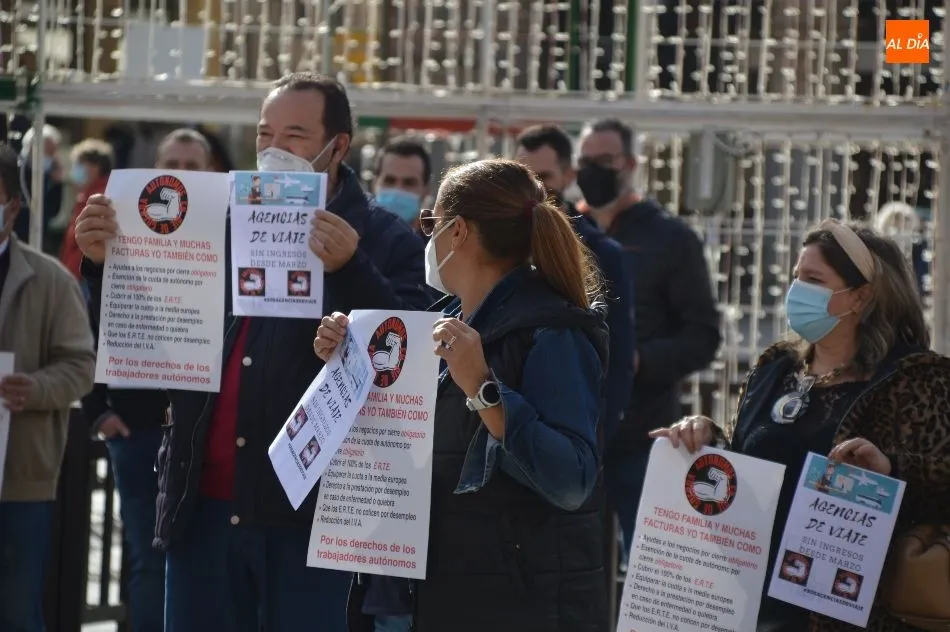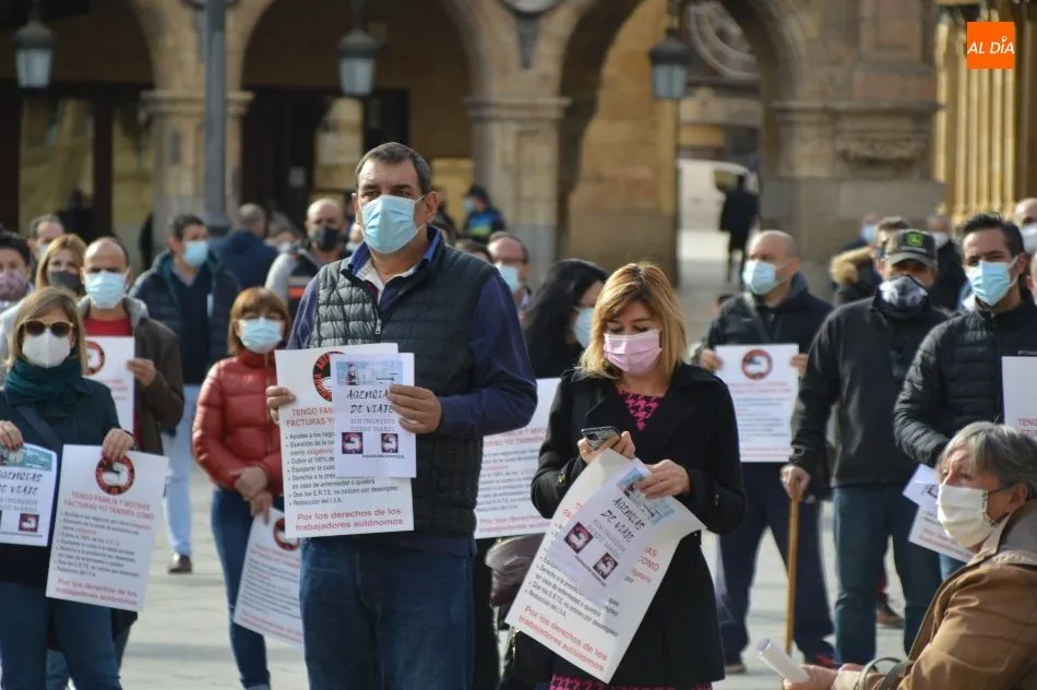 Un grupo de autónomos salmantinos se ha manifestado este lunes en la Plaza Mayor para mostrar su malestar por delicada situación económica de este colectivo que, en algunos sectores, se ha visto obligado a dejar de trabajar por las restricciones sanitarias. Por eso, entre las pancartas que mostraban destacaban lemas como ?Necesitamos trabajar?.