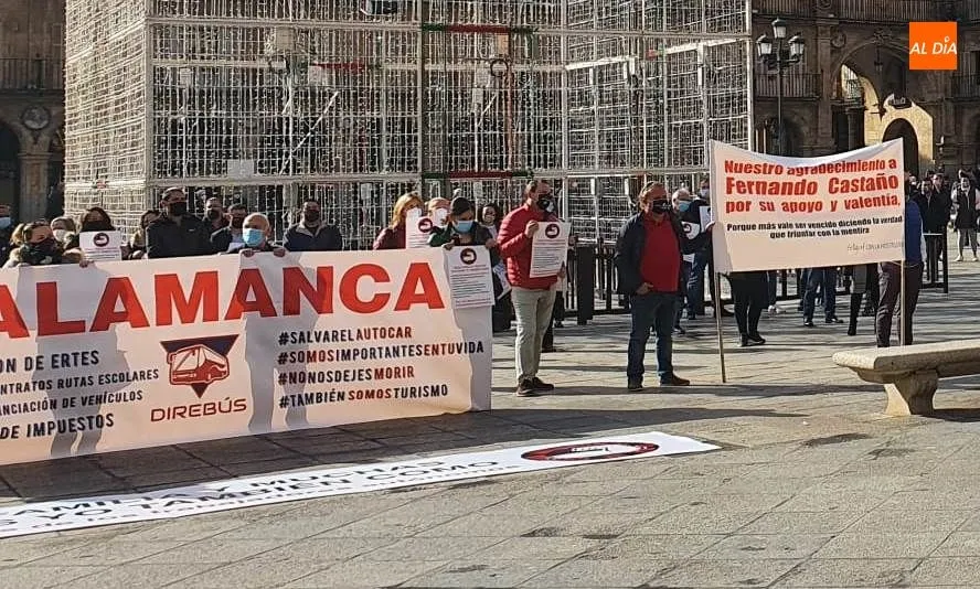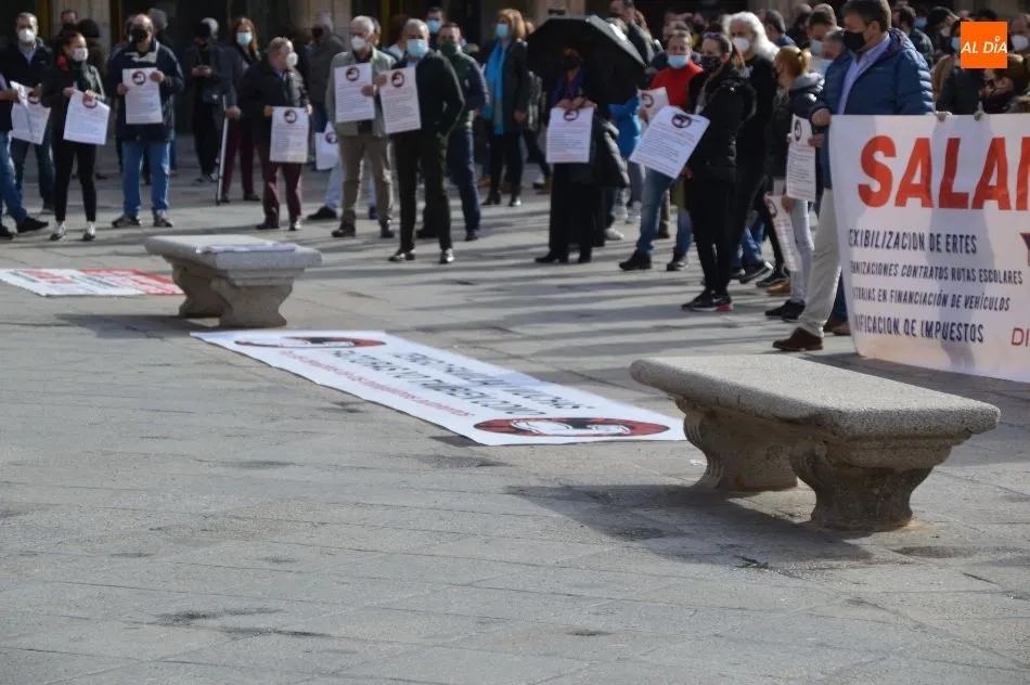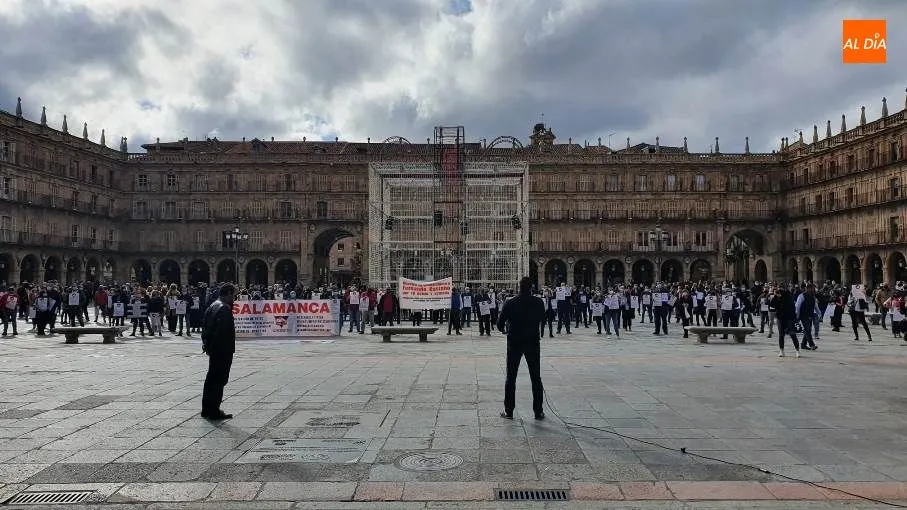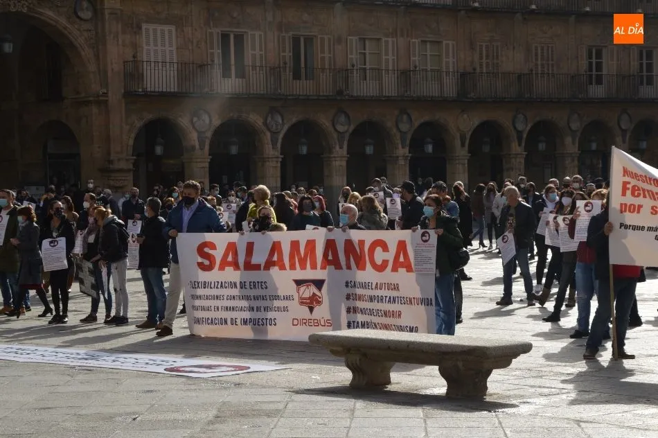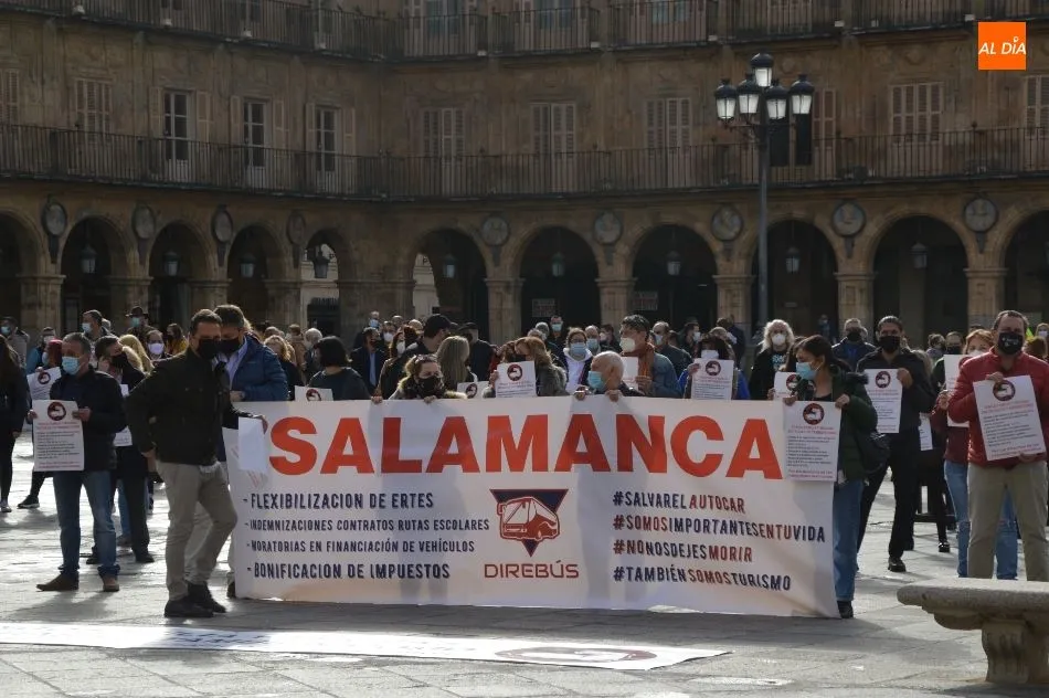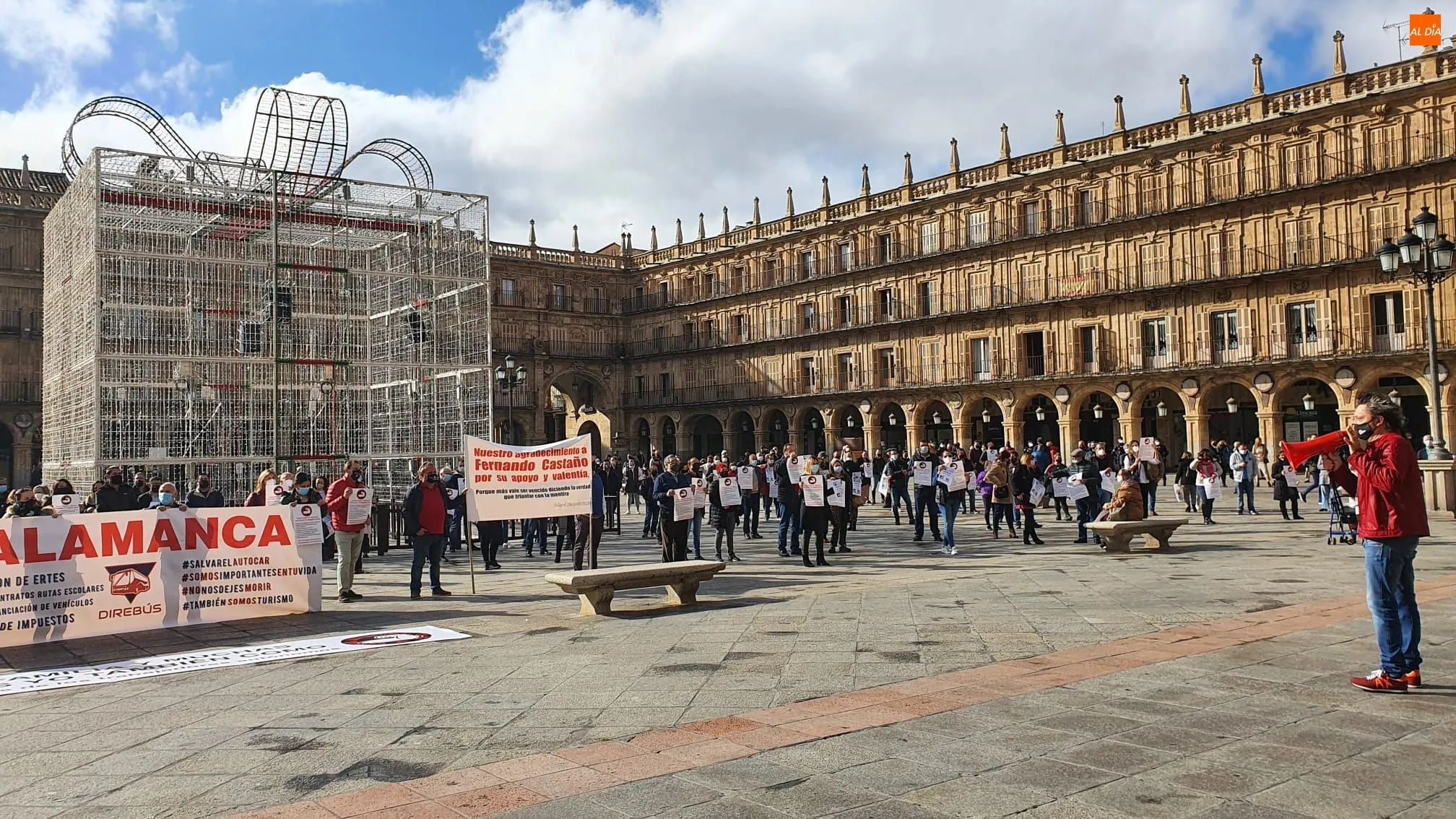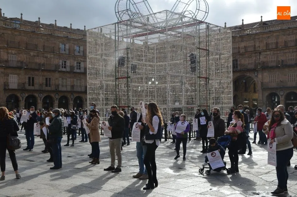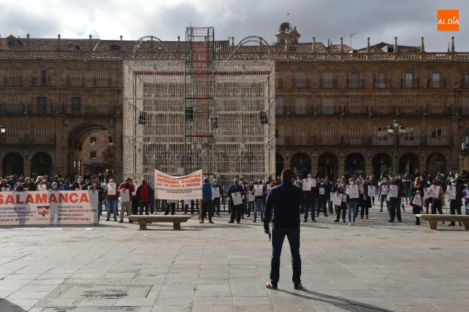 Un grupo de autónomos salmantinos se ha manifestado este lunes en la Plaza Mayor para mostrar su malestar por delicada situación económica de este colectivo que, en algunos sectores, se ha visto obligado a dejar de trabajar por las restricciones sanitarias. Por eso, entre las pancartas que mostraban destacaban lemas como ?Necesitamos trabajar?.