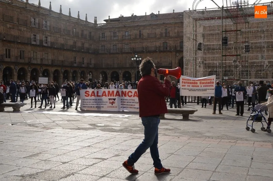 En un manifiesto que han leído y que posteriormente han entregado al alcalde de la ciudad, Carlos García Carbayo, los convocantes han solicitado la exención de la cuota de autónomo por "cierre obligatorio", cubrir el cien por cien de los procesos de ERTE, equiparar la cuota a la media europea, derecho a la prestación por desempleo en caso de enfermedad o quiebra, que el ERTE no cotice por desempleo y la reducción del IVA.