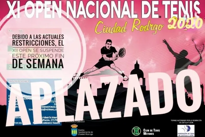 El Club de Tenis Wetones comunicó en la jornada del martes el aplazamiento del XII Open Nacional de Tenis de Ciudad Rodrigo, que inicialmente estaba previsto que se disputase el próximo fin de semana (21 y 22 de noviembre) en las pistas municipales del Valle de San Martín. El aplazamiento viene motivado por la pandemia del coronavirus, y más concretamente, por las restricciones a las que obliga, según señala en un comunicado el Club, que espera poder ?celebrarlo y disfrutarlo en breve?.