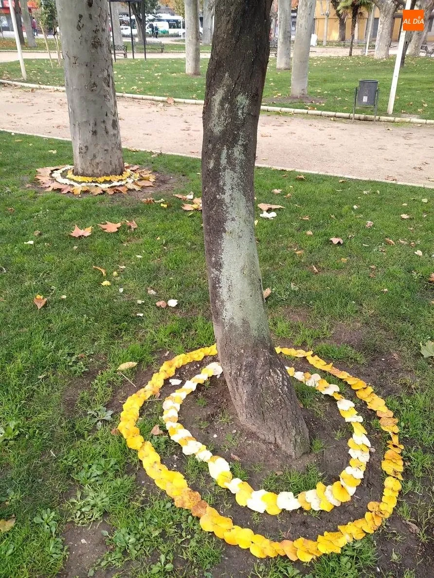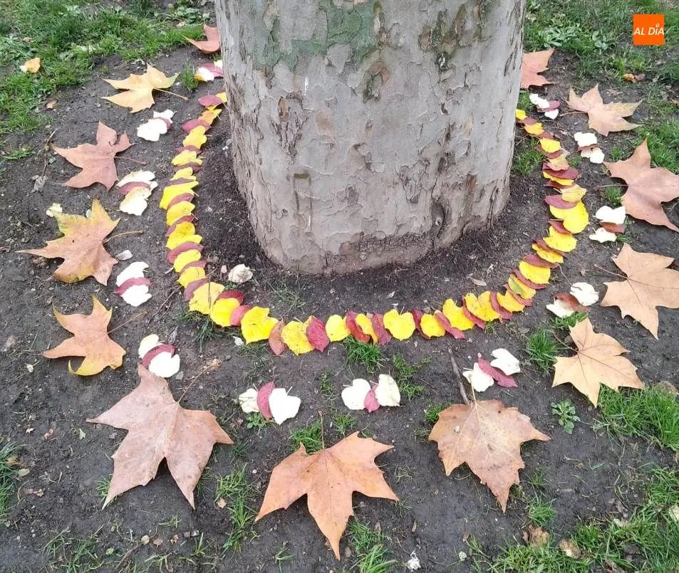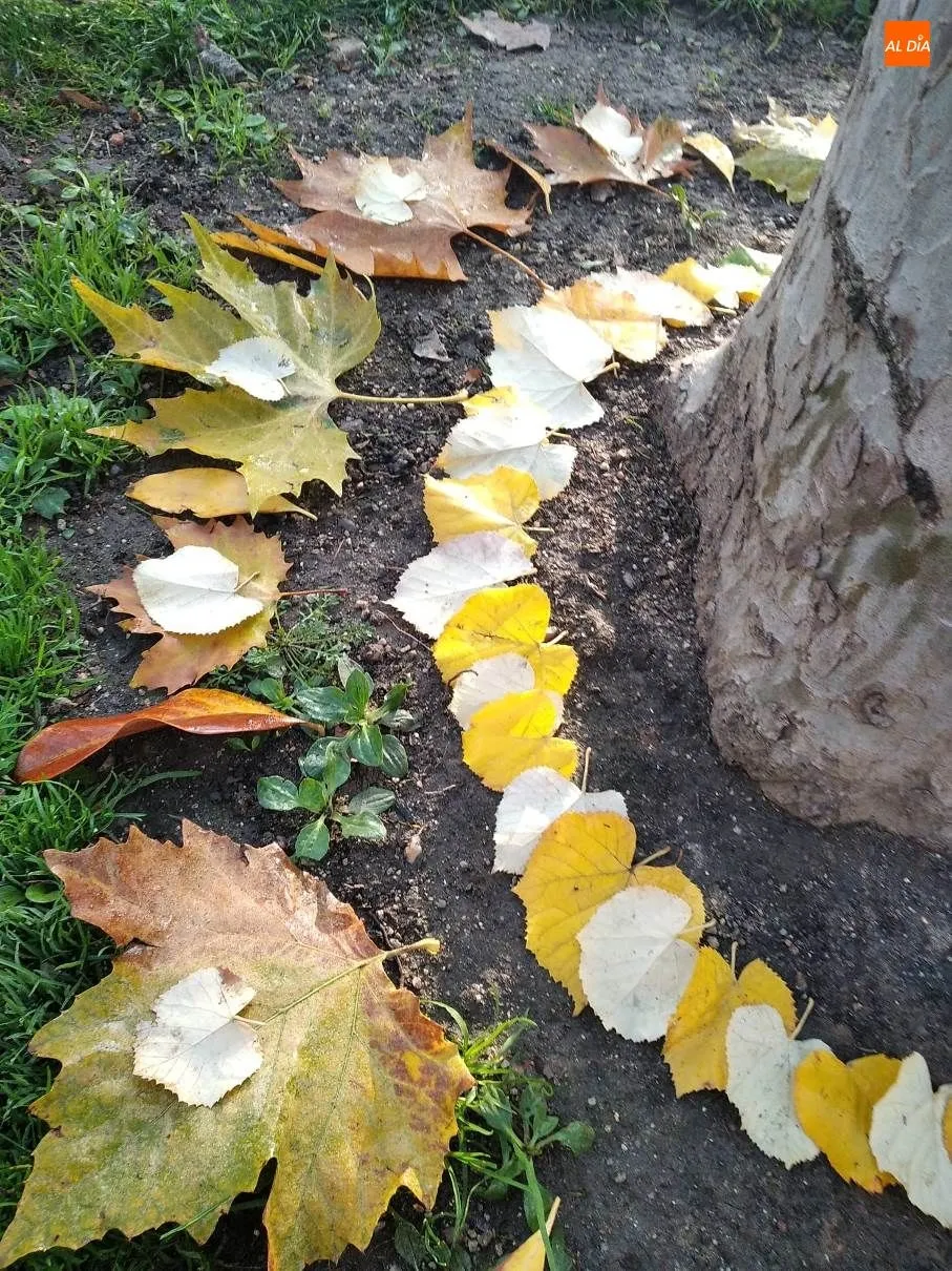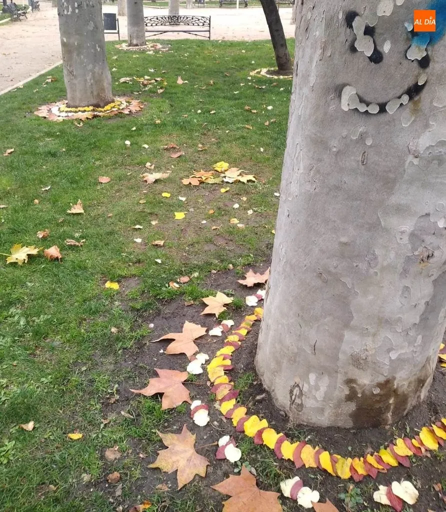 Los viandantes que pasean por el parque de la Alamedilla se han encontrado con unas llamativas composiciones artísticas, formadas por hojas de colores alrededor de los árboles.