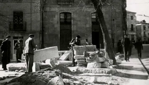 En ella se pueden ver ?varios canteros dan forma con martillo y cincel a las losas utilizadas en la reforma de la Isla de la Rúa?. Aunque Blázquez afirma que no se indica la fecha de la fotografía, algunas pistas nos ayudan a situarla cronológicamente: ?Esta zona, desde 1932, que sufrió la gran reforma, ha visto varias veces cambiado su pavimento. En este caso debe ser posterior a 1935, pues ya se encuentra levantado el edificio de la Facultad de Derecho, en aquél entonces las llamadas Cocheras de San Isidro?.