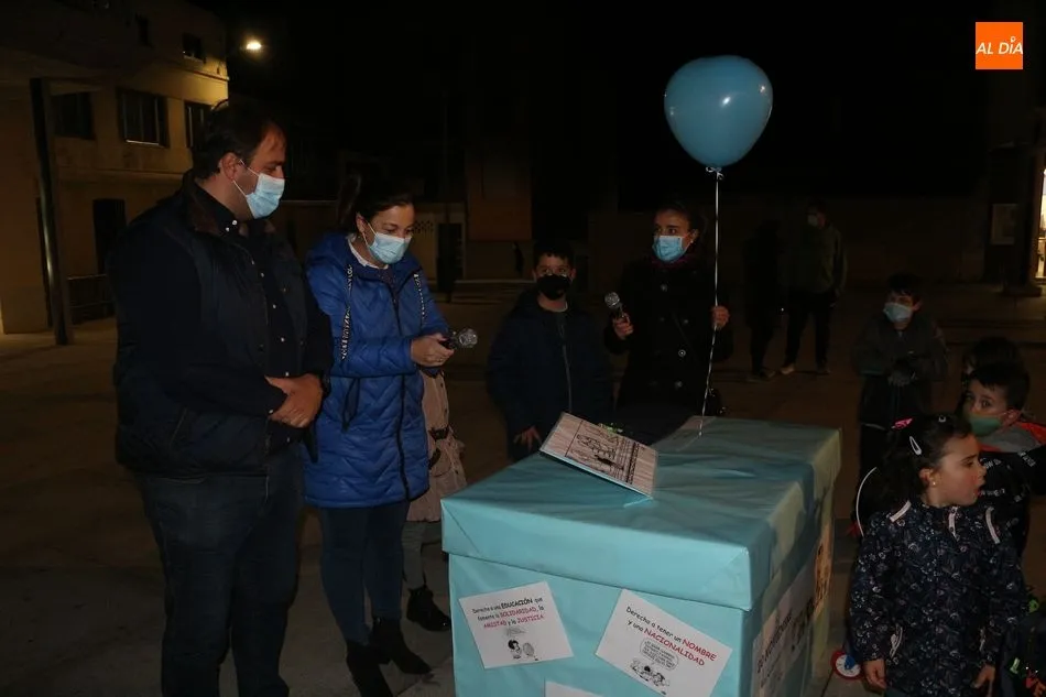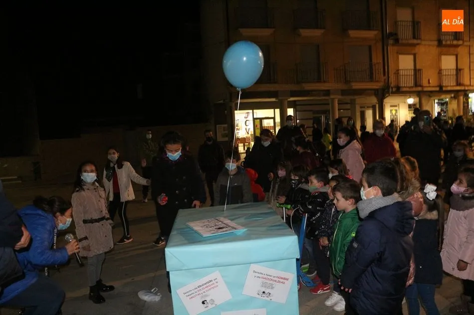 También a las 19:00 horas se ha organizado otro acto, este ya para todos los públicos, en la Plaza Mayor. Allí el alcalde, Roberto Martín, y la concejala de Cultura, María Jesús Moro, han acompañado a los niños Sergio y Aroa en la lectura de los Derechos del Niño. Acto seguido, se han soltado globos de color azul ante todos los presentes.