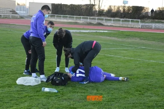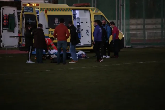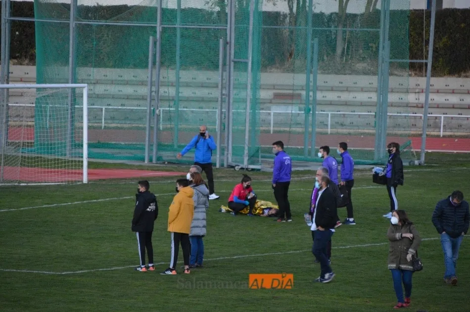 Chechu fue trasladado de Las Pistas al Hospital en ambulancia tras fisurarse las costillas. El lateral derecho del Peñaranda terminó el derbi malherido y tuvo que necesitar asistencia médica sobre el propio césped. El futbolista charro dio el susto y rápidamente se interesaron sus compañeros y miembros del cuerpo técnico por su estado.