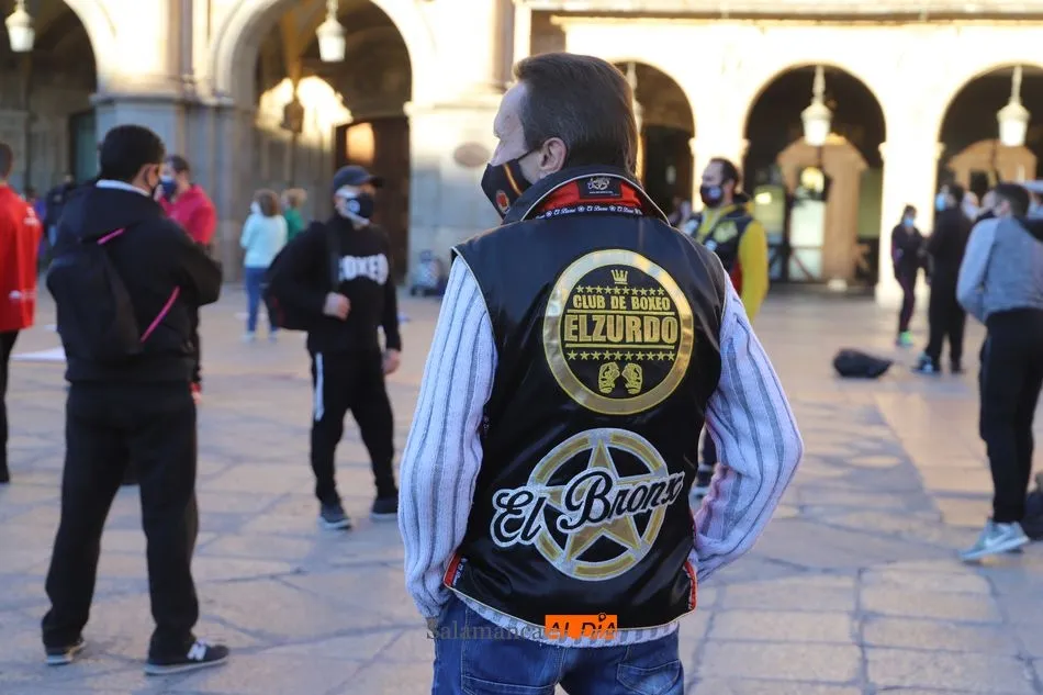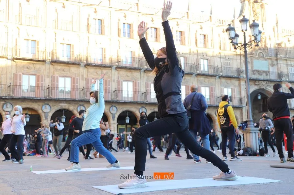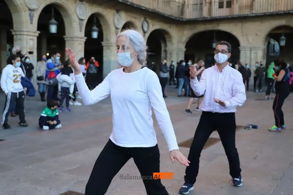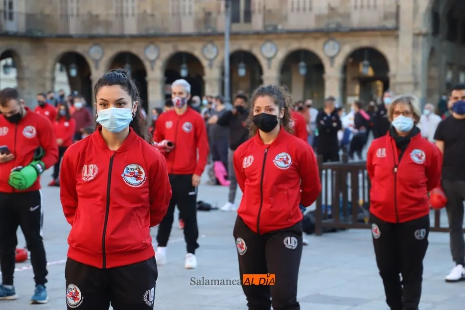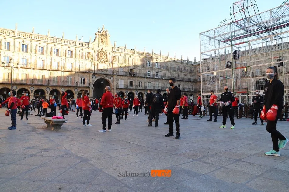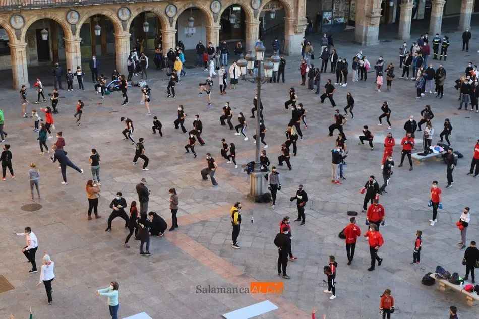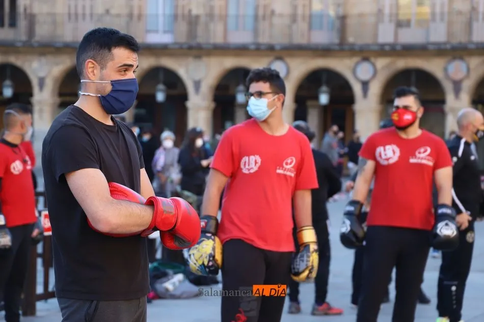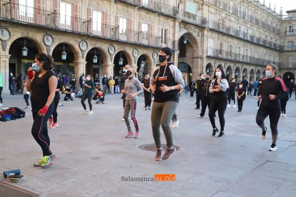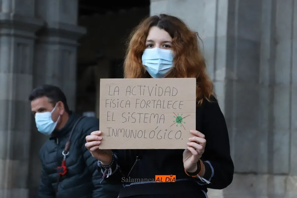 El sector de gimnasios e instalaciones deportivas se ha concentrado esta tarde en la Plaza Mayor de Salamanca para defender los derechos de más de 1000 familias que viven, de manera directa o indirecta, de este sector.