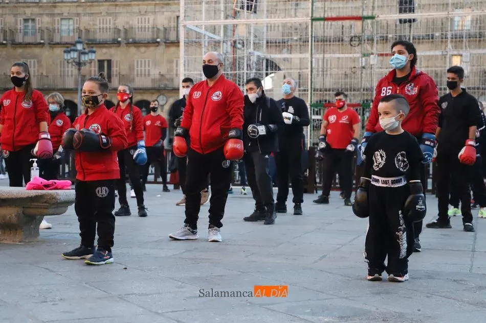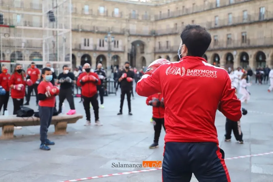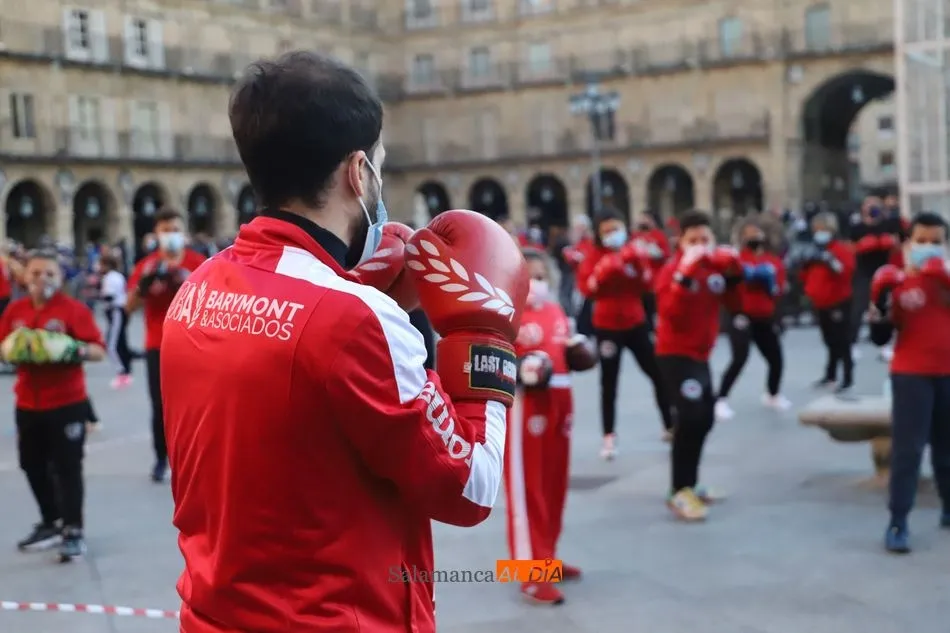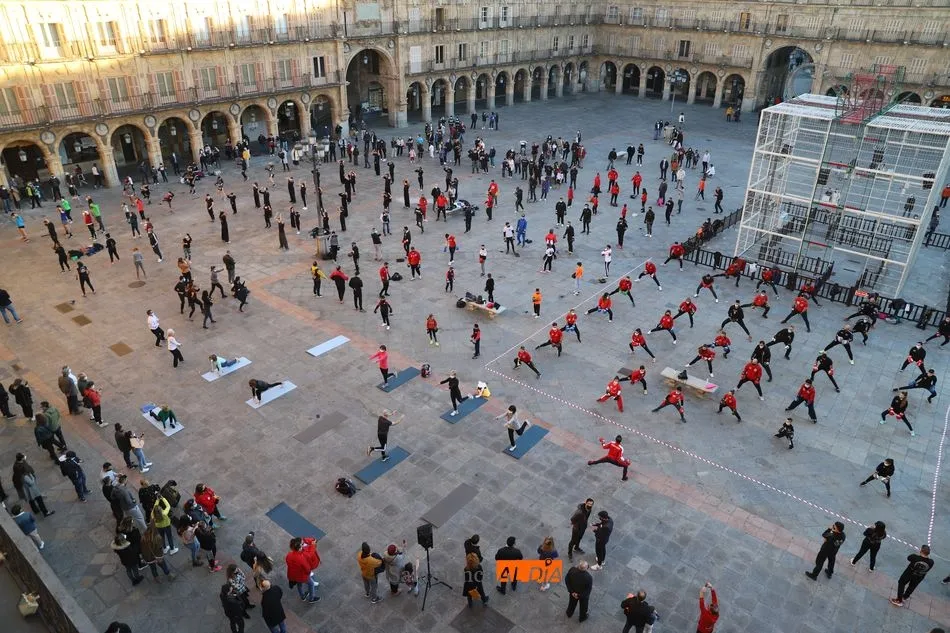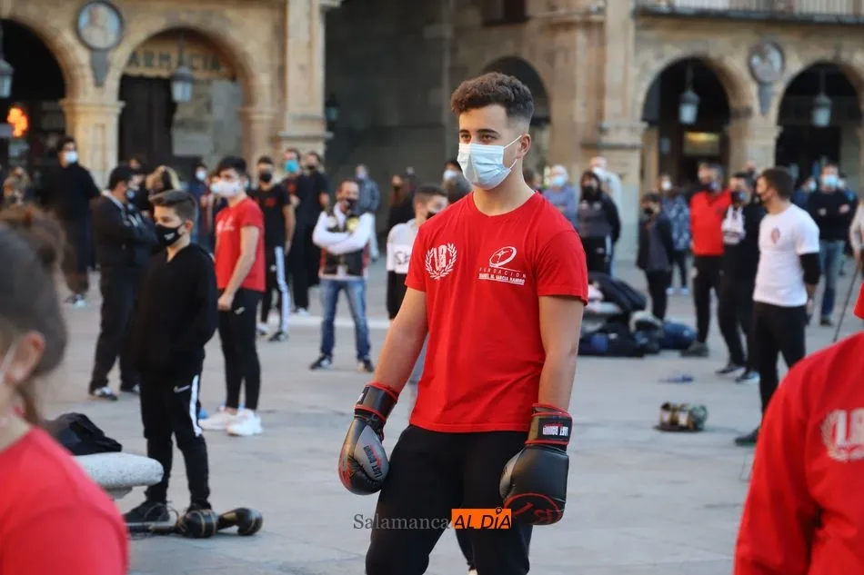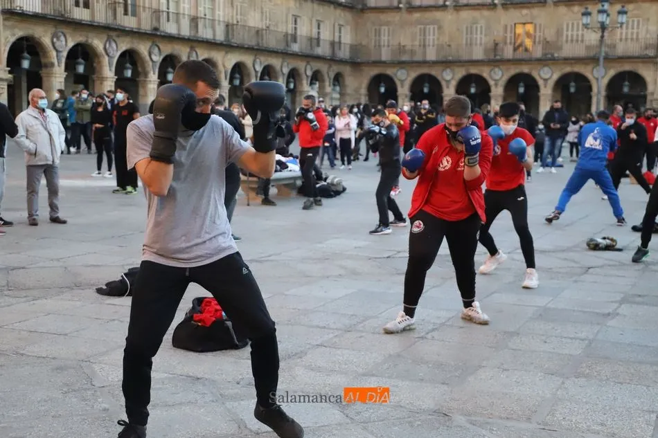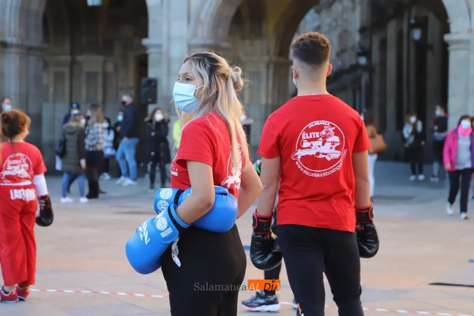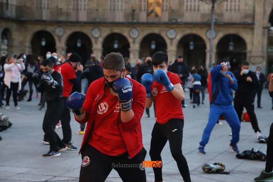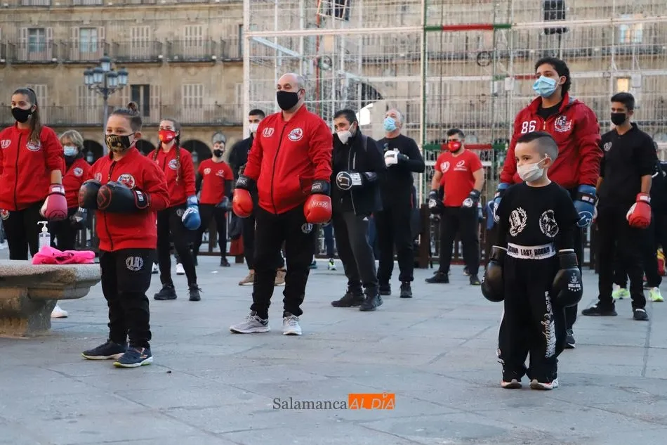 El sector de gimnasios e instalaciones deportivas se ha concentrado esta tarde en la Plaza Mayor de Salamanca para defender los derechos de más de 1000 familias que viven, de manera directa o indirecta, de este sector.