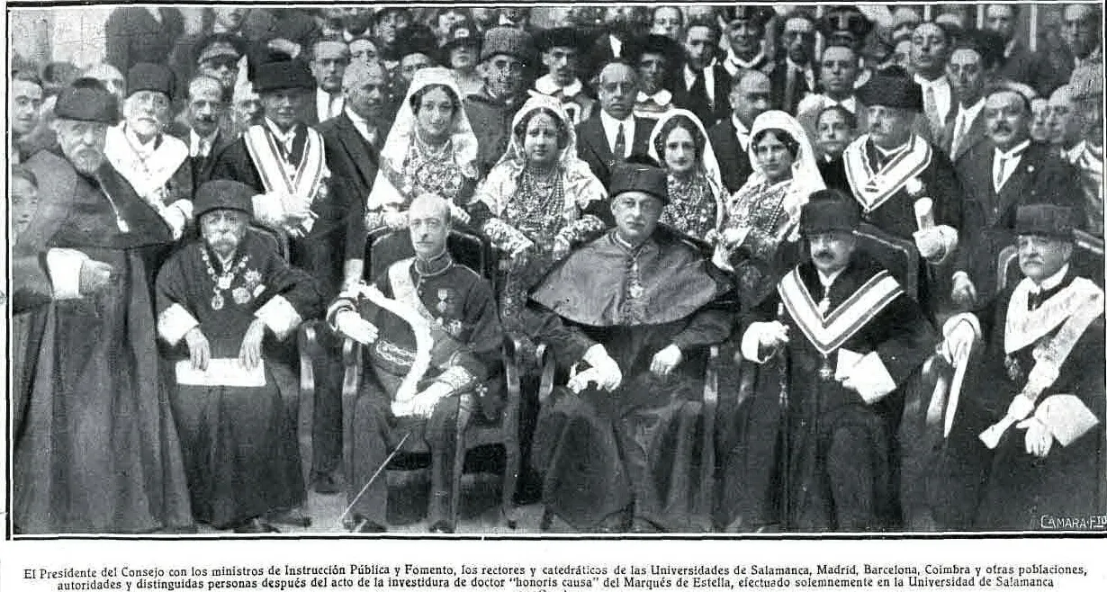 En el Paraninfo de la histórica Universidad de Salamanca se llevó a cabo, el día 1 de noviembre de 1926, la apertura del curso y el solemne acto de imponer al marqués de Estella el birrete de doctor "honoris causa" en la misma.